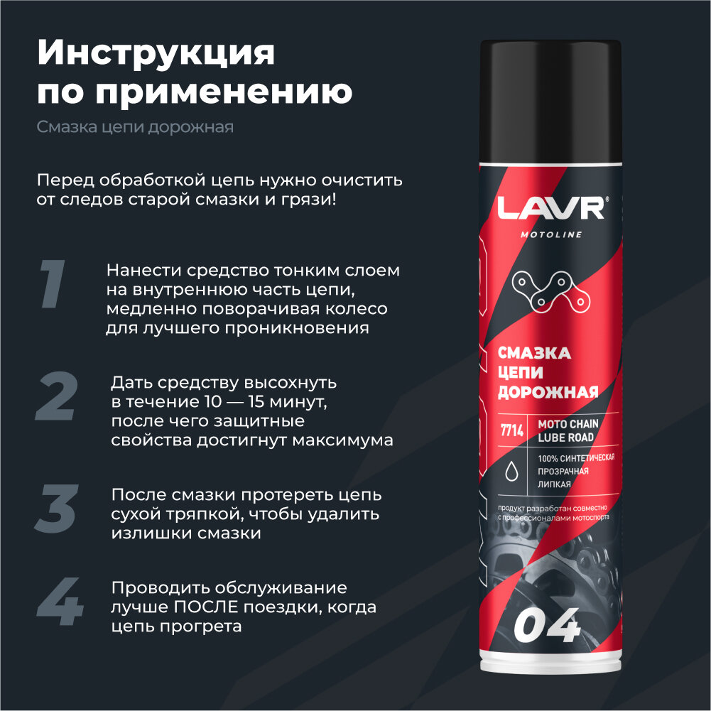 СохранитьLavr Moto Смазка Цепи Дорожная, 400 Мл LAVR арт. Ln7714 интересное: