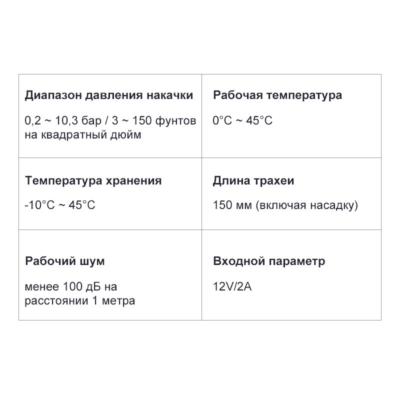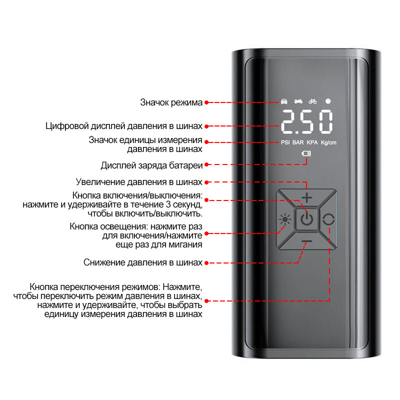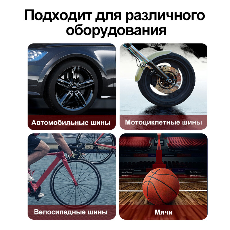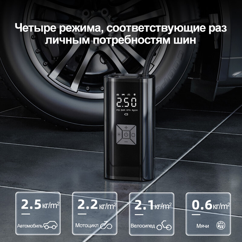 | Подробная комплектация | Автомобильный компрессор, надувная трубка, порт для накачки*4, кабель для зарядки type-c |