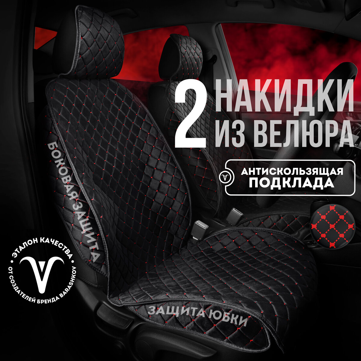 СохранитьCarCape/ Накидки на сиденья автомобиля из велюра 2 шт. Коплект накидок на передние сиденья. Модель ISTANBUL+ с боками. Черный/красная строчка интересное: