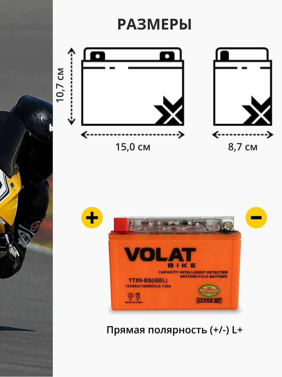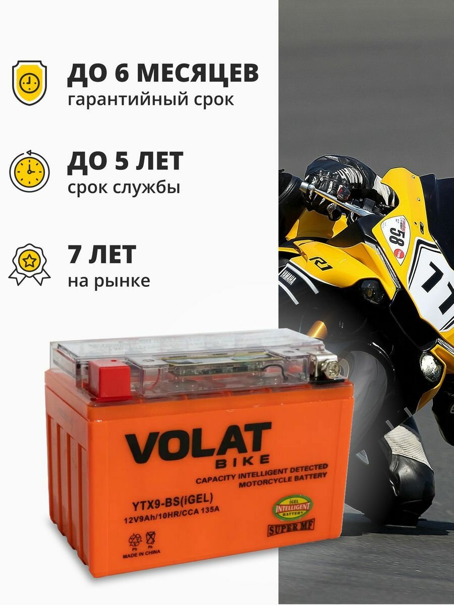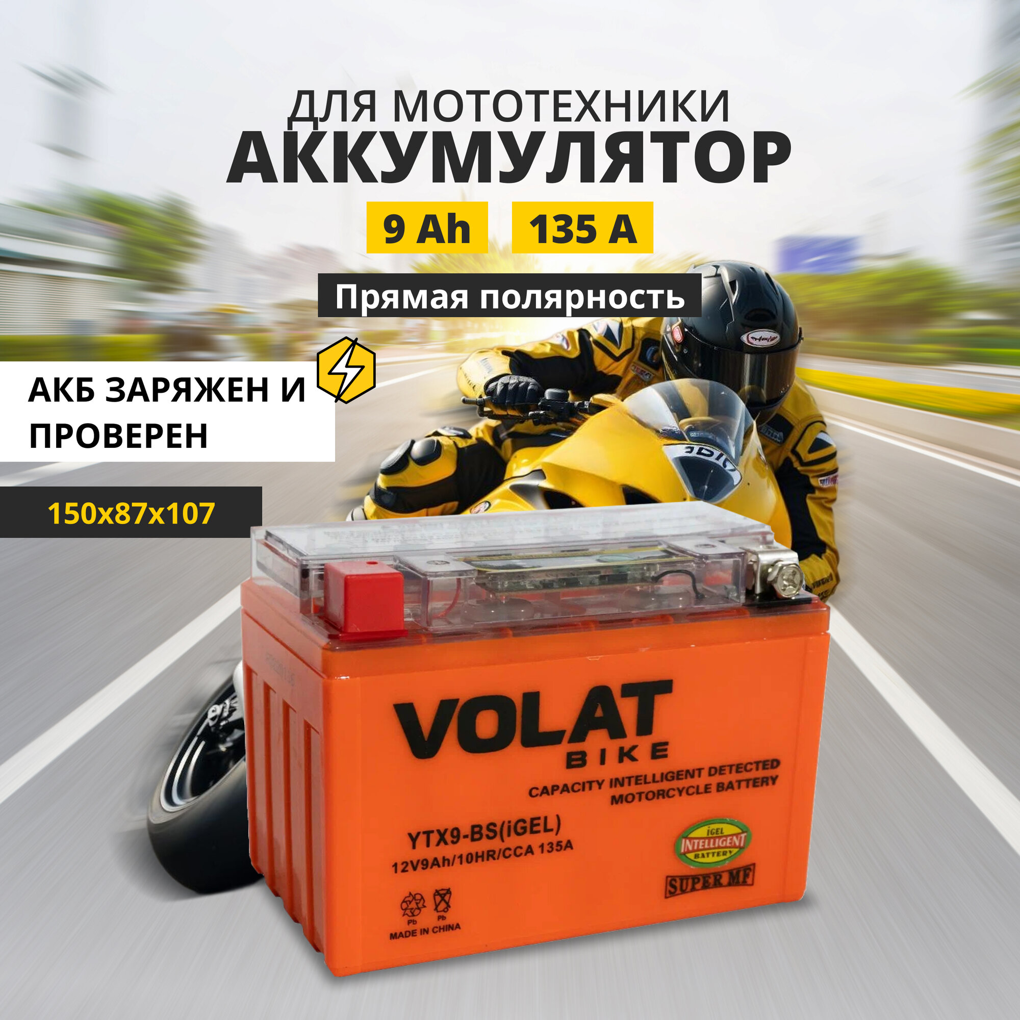 Аккумулятор для мотоцикла 12v Volat YTX9-BS(iGEL) прямая полярность 9 Ah 135 A гелевый, акб на скутер, мопед, квадроцикл 150x87x107 мм интересное:
