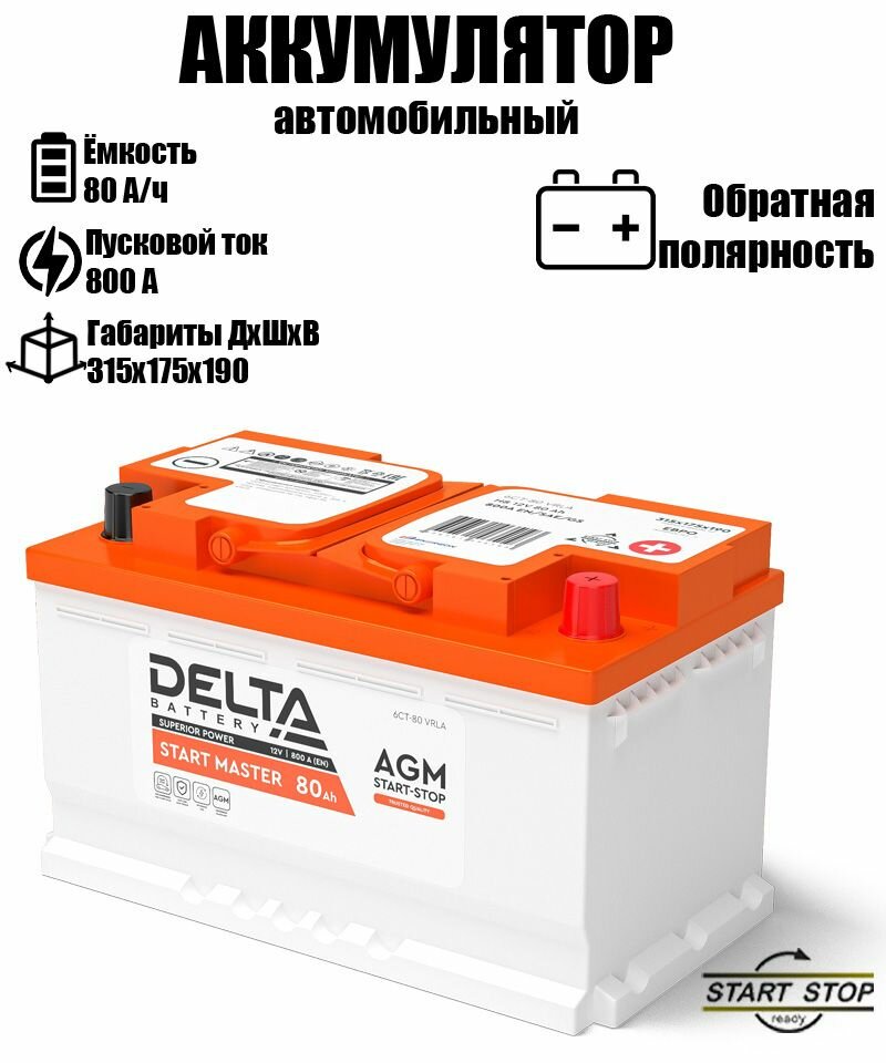 Купить Аккумулятор DELTA AGM 1280 Start-Stop (12В 80Ач 800А 315х175х190) обр.пол.