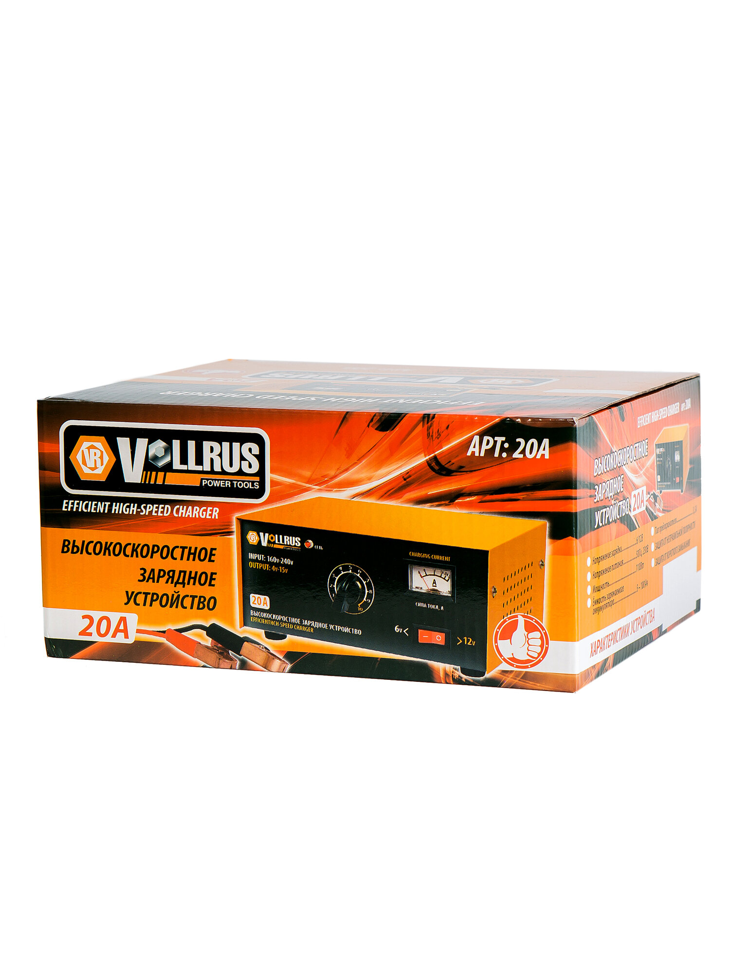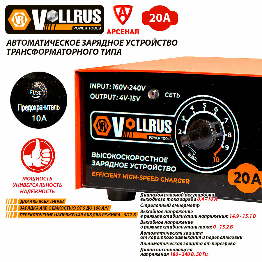 Зарядное устройство для АКБ 5-100 А/ч; 6/12V автомобильное трансформаторное VollRus, VLR20A интересное: