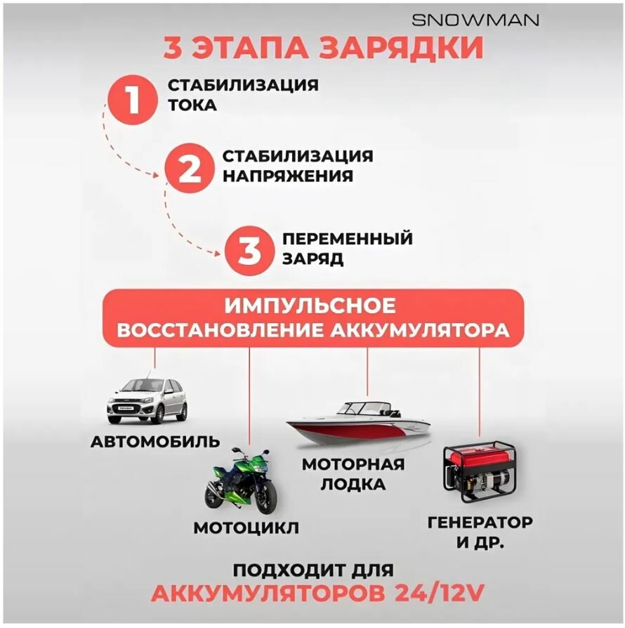 | Функции | автоматическое отключение зарядки / подходит для AGM/GEL аккумуляторов / режим зимней зарядки |