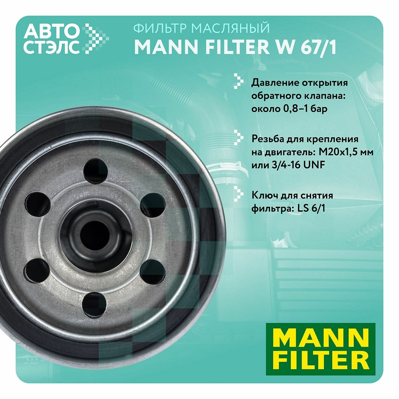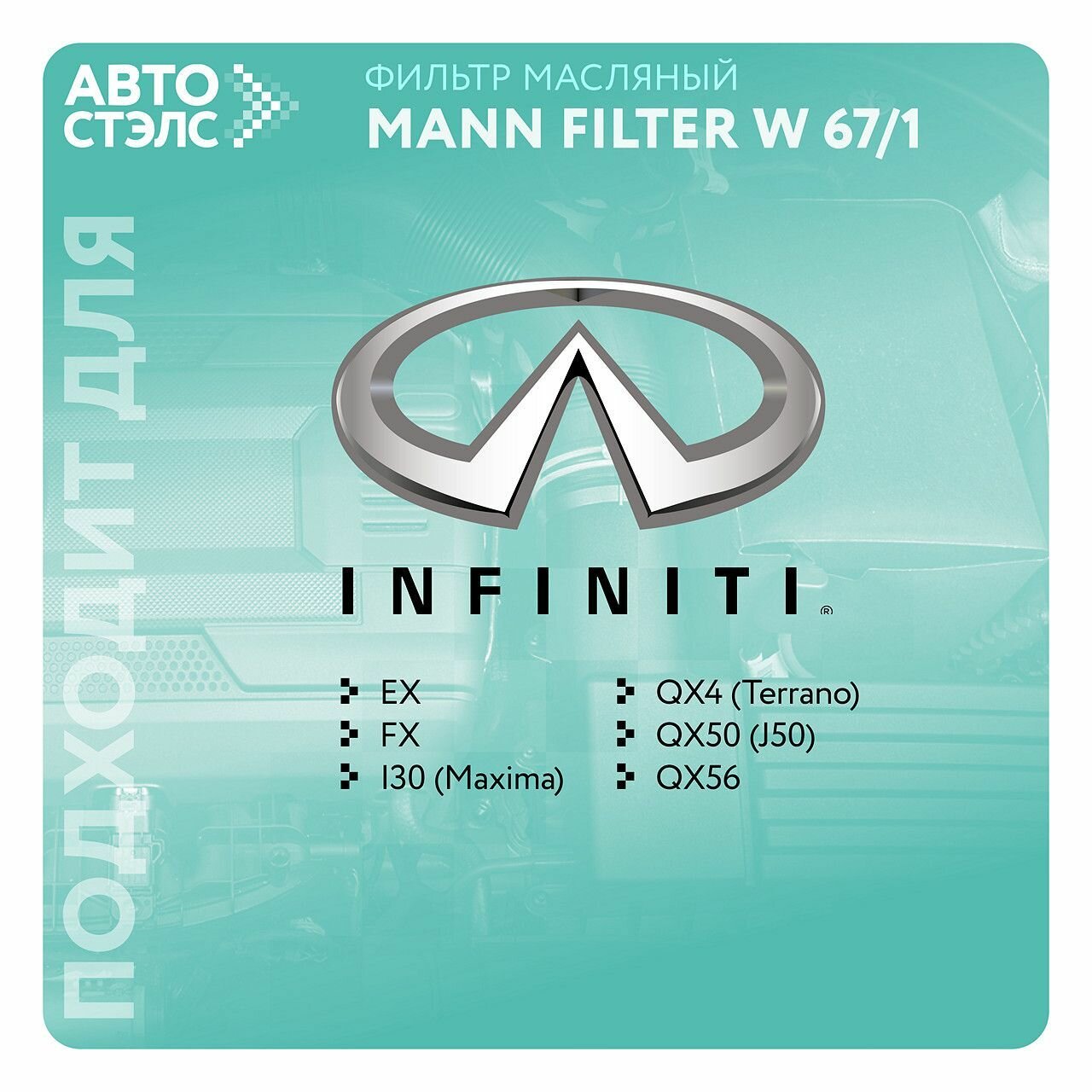 Фильтр масляный масляный фильтр MANN FILTER / OPEL NISSAN MAZDA MITSUBISHI KIA. OEM: W67/1. Киа Опел Рено Мазда Ниссан