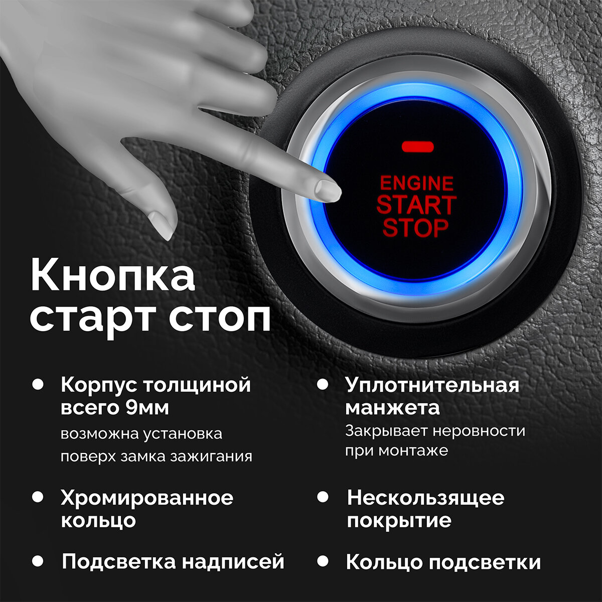| Дополнительная информация | Наша кнопка обладает важным и неоспоримым преимуществом перед аналогами. Благодаря тонкому дизайну и лепестковым креплениям ее можно без труда поставить не только в любое место на панели, но и установить прямо поверх замка зажигания без его демонтажа. |