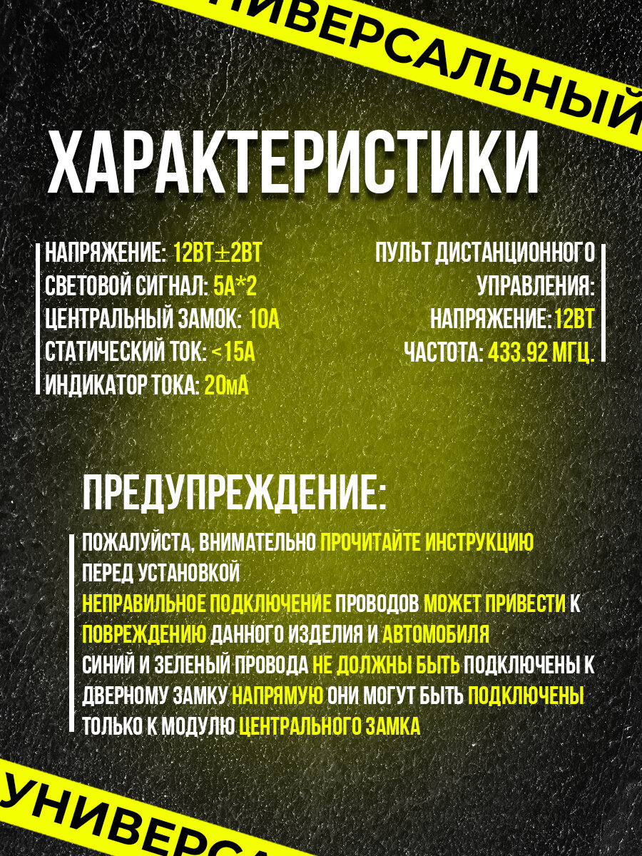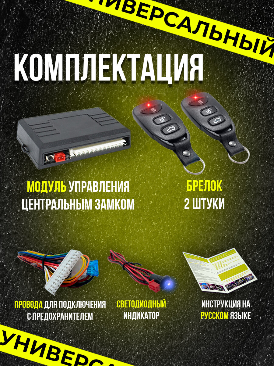 | Подробная комплектация | Блок управления центральным замком - 1 шт.; LED индикатор - 1 шт.; Разветвитель проводов с предохранителем - 1 шт.; Брелок управления центральным замком - 2 шт. |