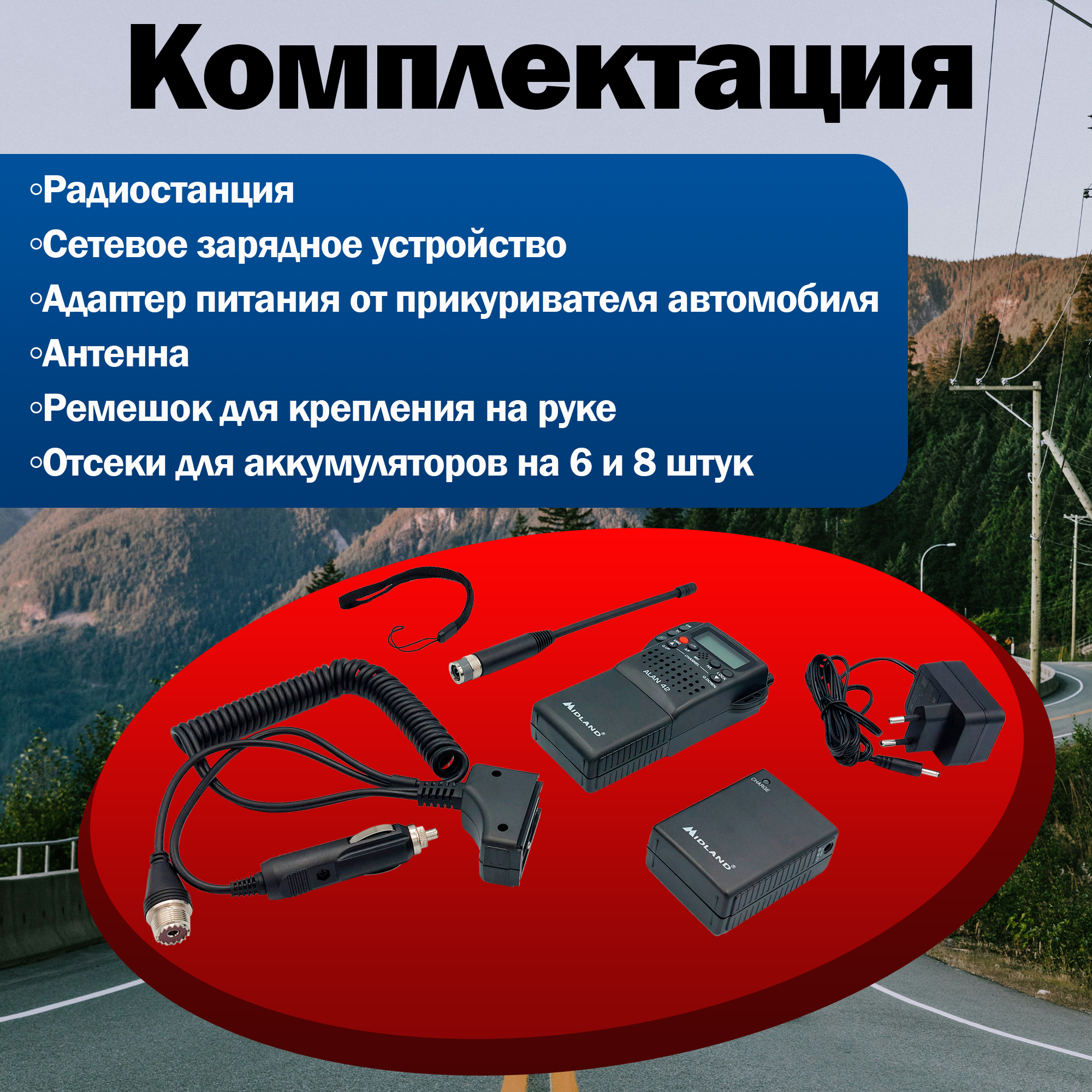 | Комплектация | Рация Alan 42; Адаптер питания от прикуривателя автомобиля; Удобный чехол; Съёмная антенна; Наручный ремешок; Клипса для крепления на поясе; Кассеты на 6, 8 аккумуляторных батарей; Инструкция |