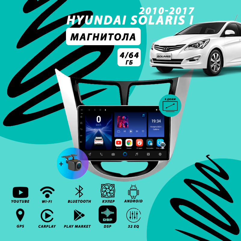 Магнитола Hyundai Solaris 1 (2010-2017) 4Гб+64Гб/черная/DSP/Android/Carplay/кулер/Wi-Fi/Bluetooth/2din/штатная магнитола