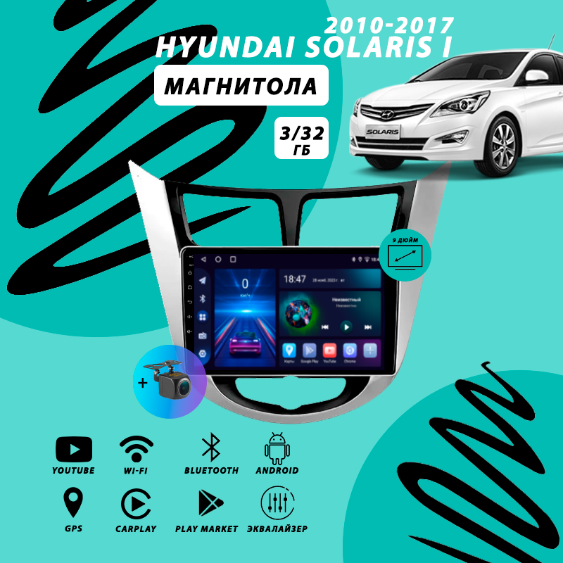 Магнитола Hyundai Solaris 1 (2010-2017) 3Гб+32Гб/серебристо-черная/Android/Carplay/Wi-Fi/Bluetooth/2din