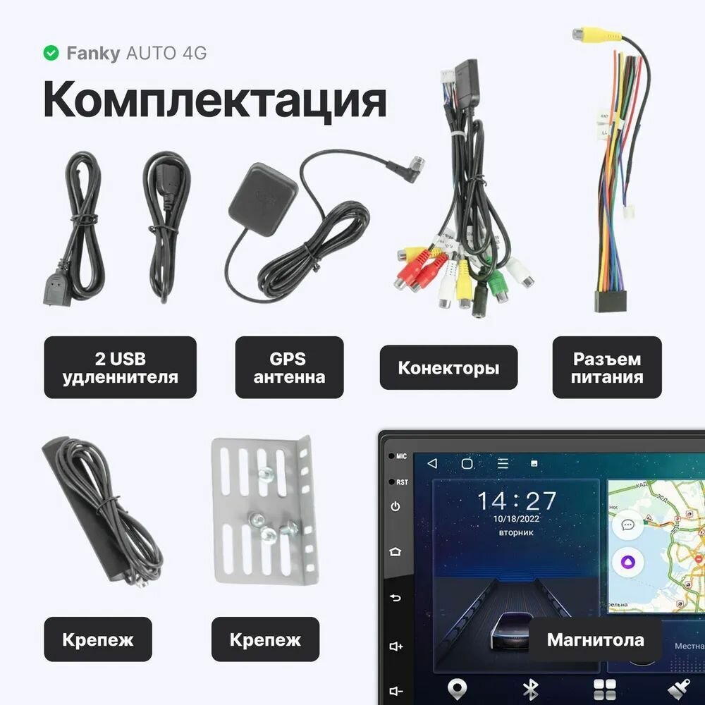 | Подробная комплектация | Автомагнитола Fanky Auto ОЗУ 2 Гб - Общая память 32гб GPS антенна4G антенна с слотом под симкартуUSB удлинители 2 штПровода для подключения звука и питанияПровода под видео выходы/входы на сабвуфер, усилитель и AUXКрепления уголки2 USB проводаПереходник на камеру заднего вида и регистратора |