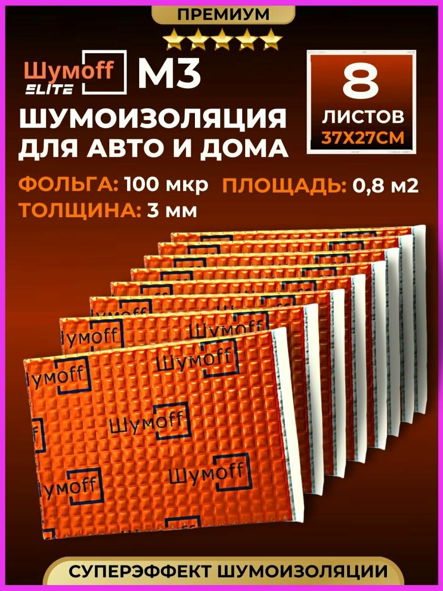 Виброизоляция Шумофф М3 - 8 листов, размер 27см. x 37см, толщина 3 мм. Шумоизоляция для автомобиля: дверей крыши потолка пола салона багажника капота канализационных труб