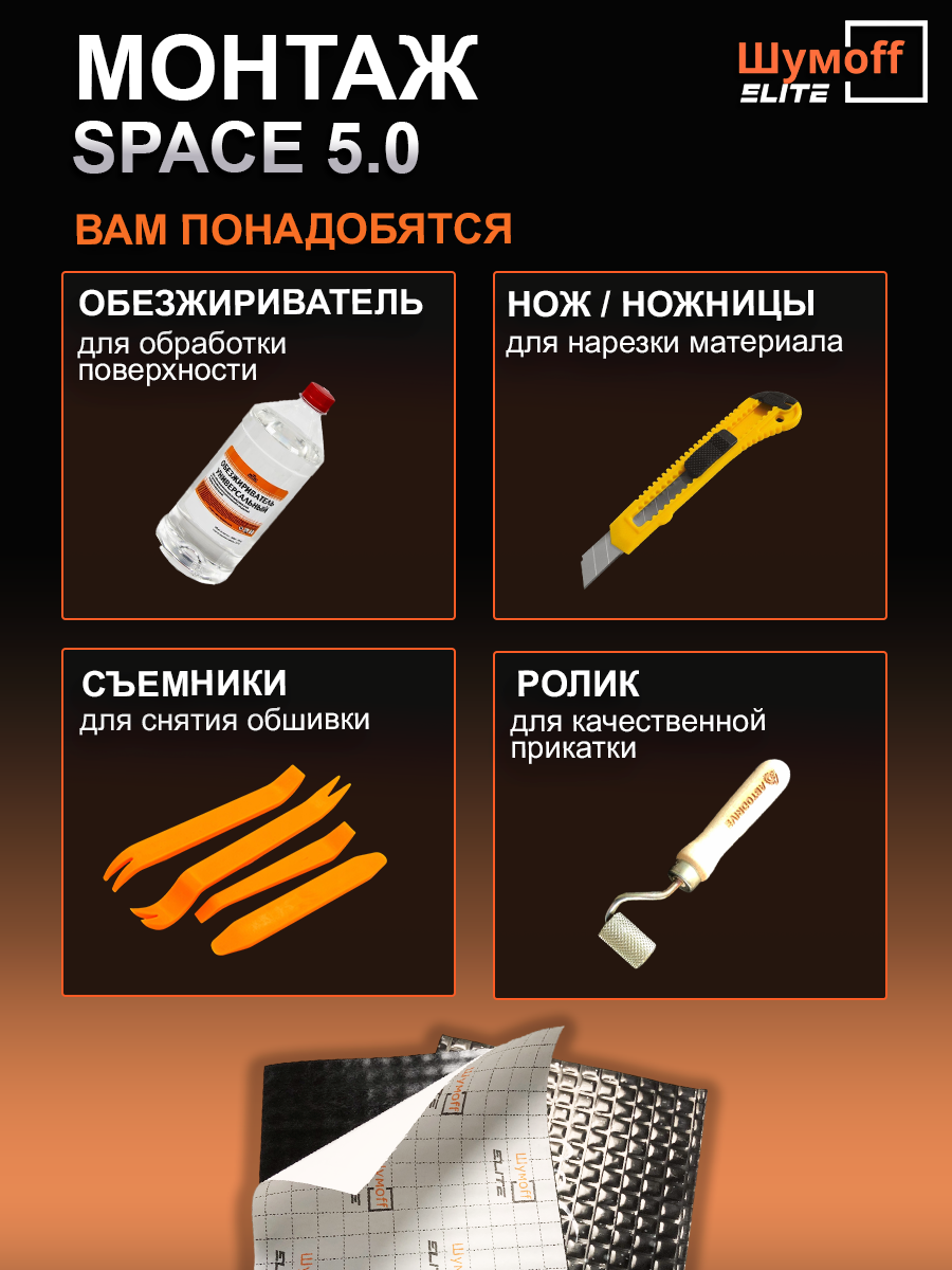Виброизоляция авто Шумофф Спейс 5,0 - 10 листов + ролик прикаточный. Шумоизоляция для автомобиля Шумоff Space 5 мм, шумка в авто, вибропласт, вибродемпфер. Шумоизоляция для дверей, крыши, потолка, арок, пола, багажника, канализационных труб, стояка, ванны
