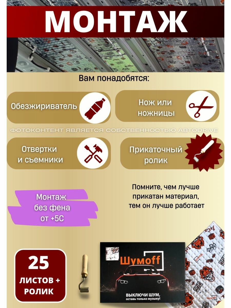 СохранитьШумоизоляция для автомобиля Джек 25 листов + ролик прикаточный. Толщина 2 мм = 3 мм. Виброизоляция авто, вибропласт, вибродемпфер, шумка в машину. Шумоизоляция для дверей, крыши, потолка, капота, локеров. Звукоизоляция в авто Шумоff Jack. интересное: