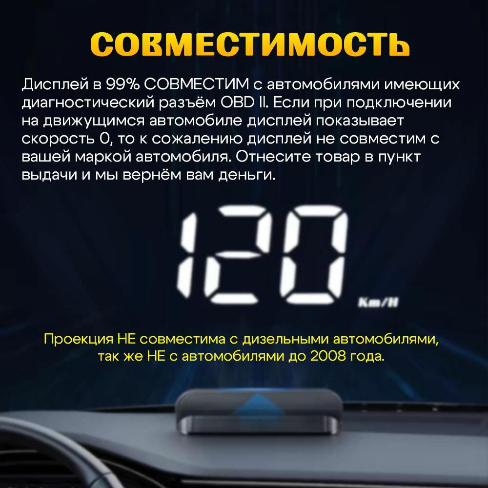 | Совместимость | Дисплей в 99% совместим с автомобилями имеющих диагностический разъём OBD II. |