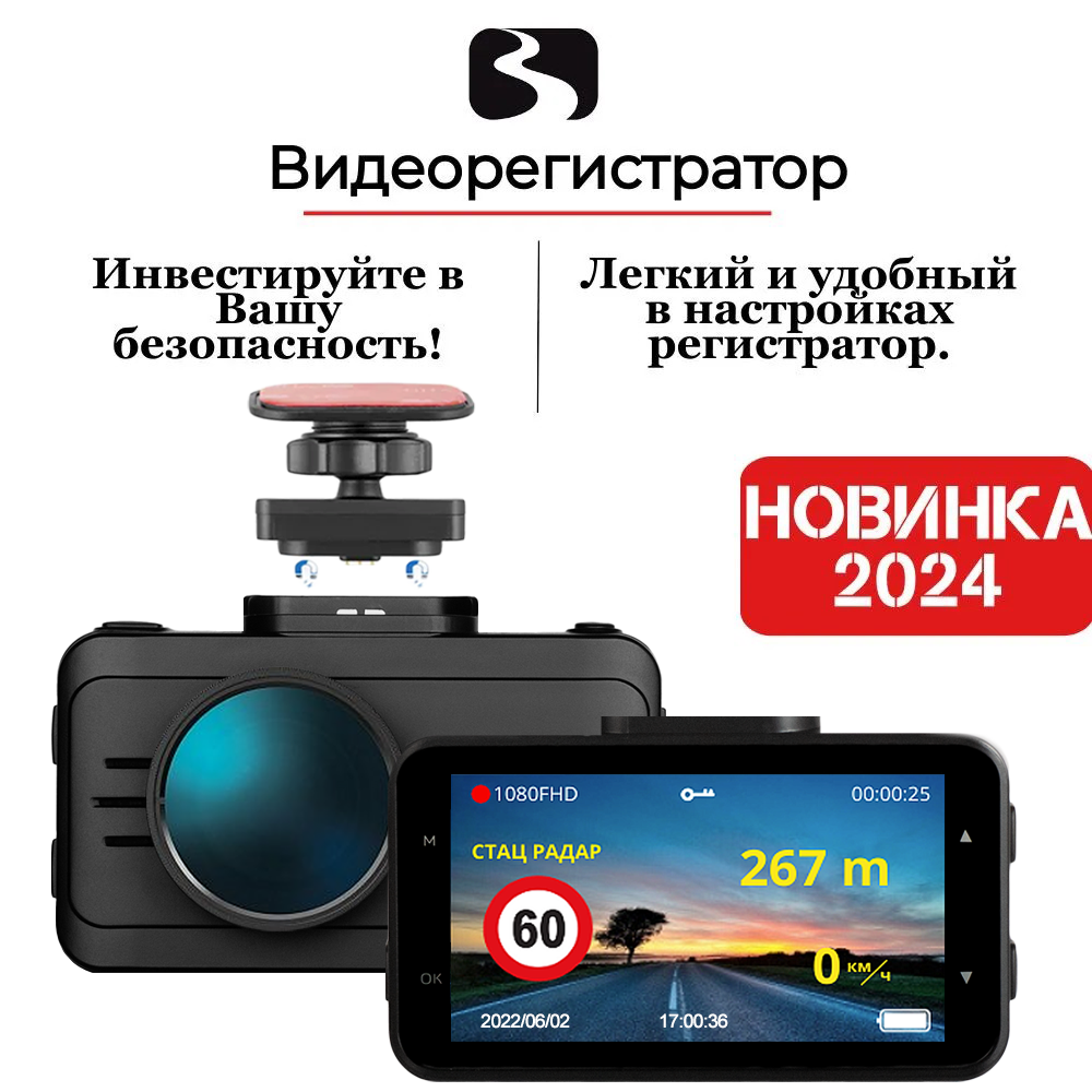Видеорегистратор с оповещениями о камерах Blackview V PRO MAX - 2 камеры, поворотные крепления на скотче и присоске