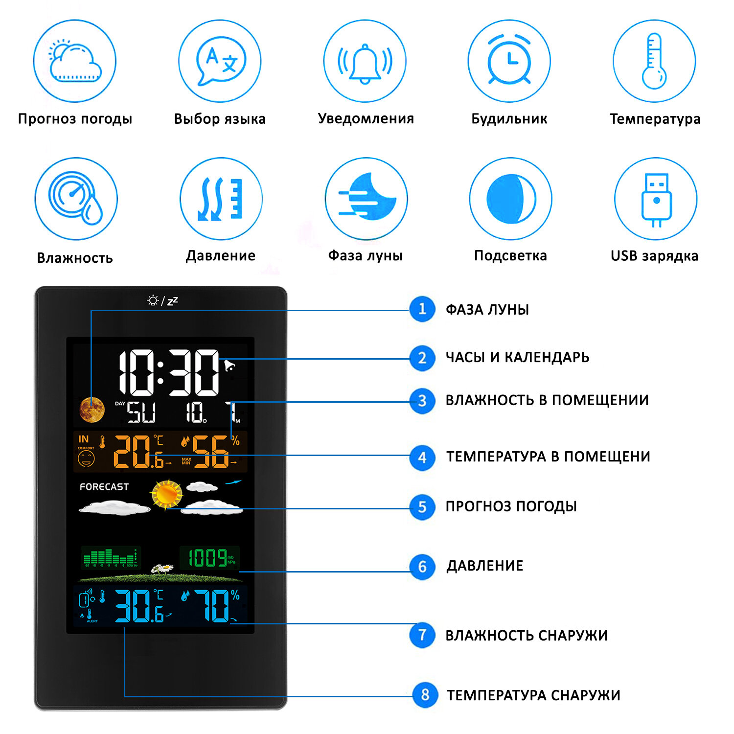 Погодная станция для дома с беспроводным внешним датчиком / Цифровая метеостанция с прогнозом погоды / Black интересное: