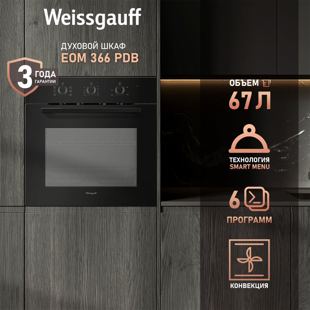 Купить Духовой шкаф Weissgauff EOM 366 PDB, 60 см, 3 года гарантии, Утапливаемые рукоятки PIPO, Эмаль SMART CLEAN, гриль, 2 стекла в дверце