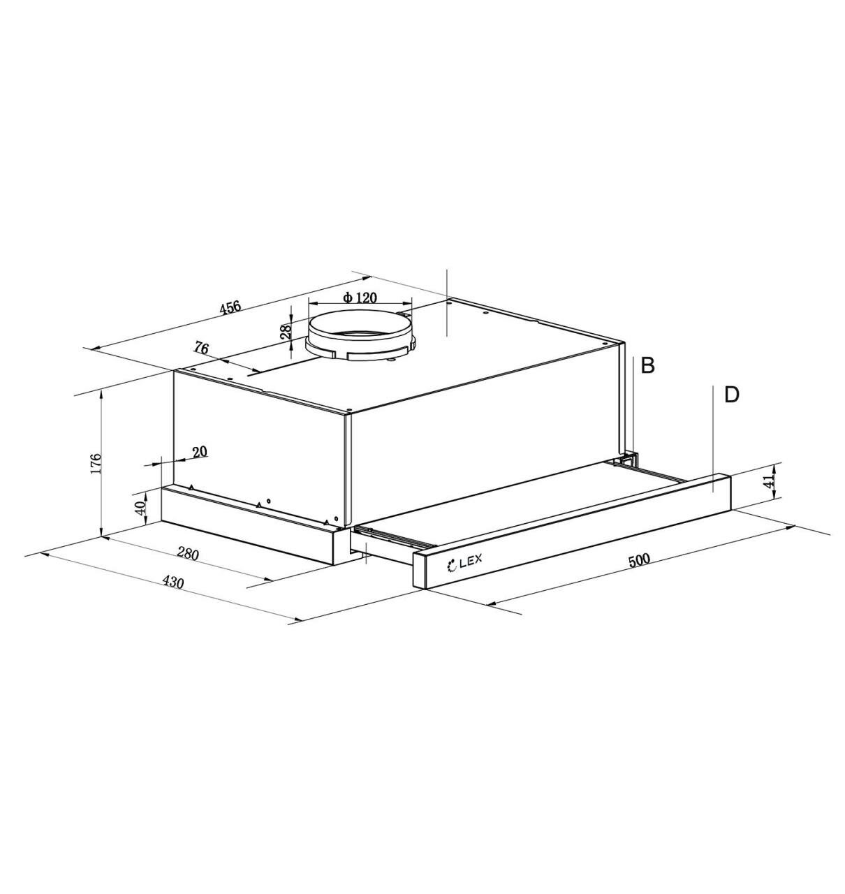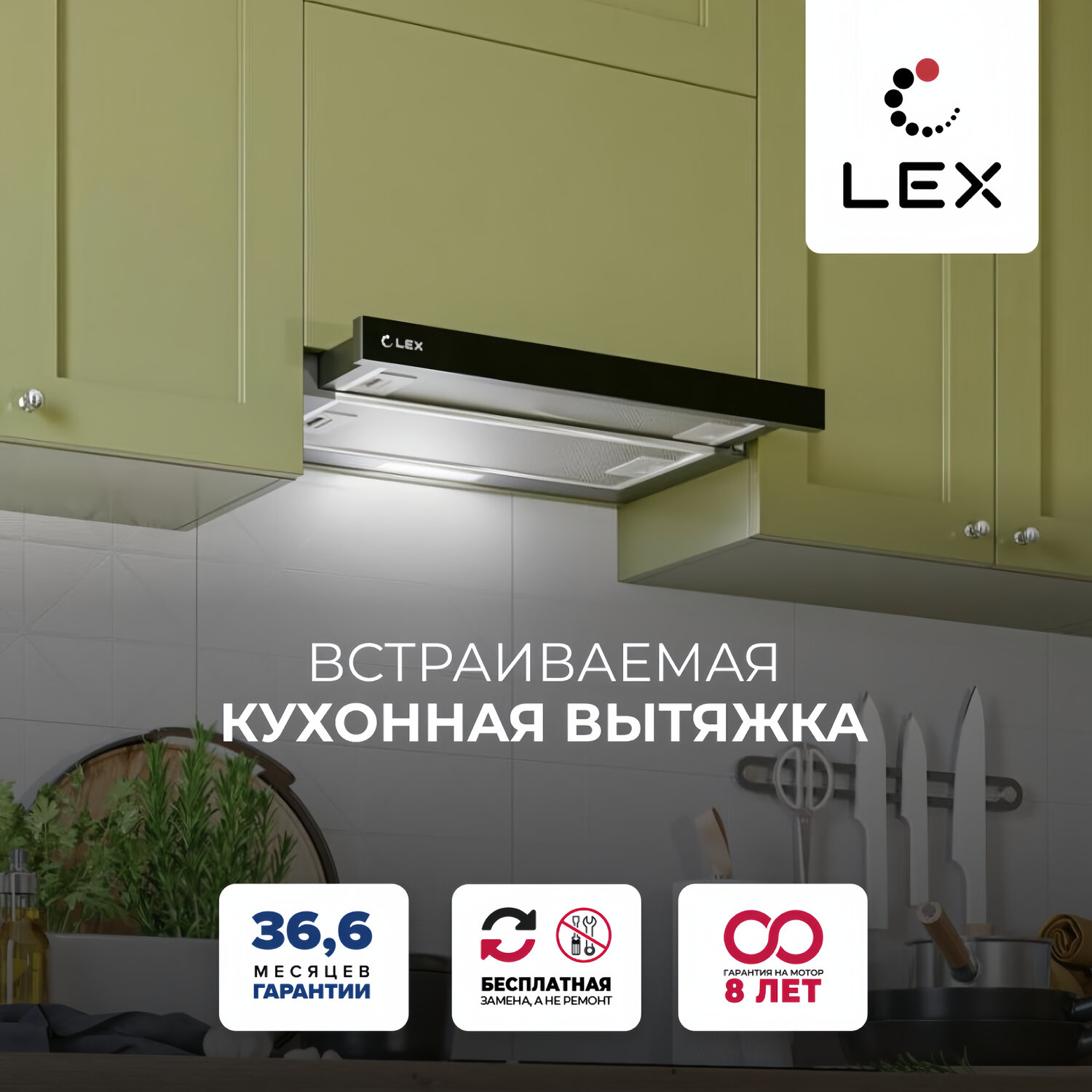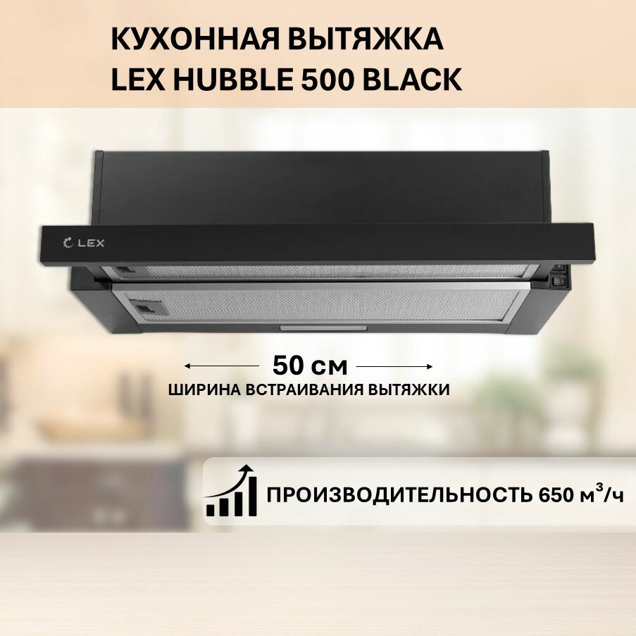 Вытяжка кухонная встраиваемая LEX HOGAN 500 BLACK, 50 см, мотор усиленной мощности, тихий режим работы, отделка -окрашенная сталь, клавишное управление, 2 скорости. интересное:
