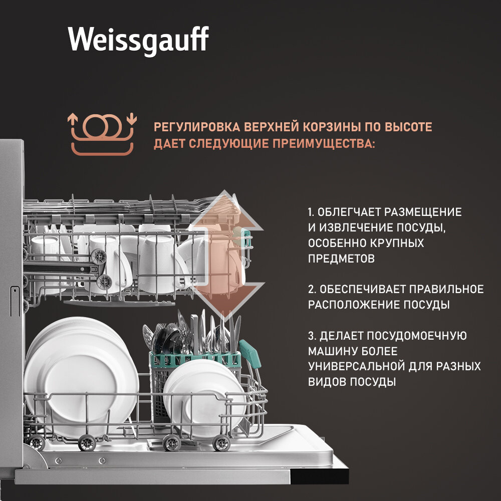 Встраиваемая посудомоечная машина Weissgauff BDW 4526 D,узкая 45 см ,3 года гарантии, 10 комплектов посуды, 6 программ, быстрый режим, 90 минут, интенсивная программа, дополнительная сушка, таймер, Индикаторы соли и ополаскивателя, дозагрузка интересное:
