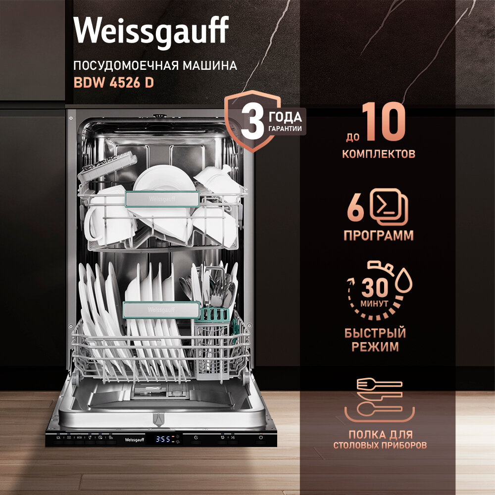 Купить Встраиваемая посудомоечная машина Weissgauff BDW 4526 D,узкая 45 см ,3 года гарантии, 10 комплектов посуды, 6 программ, быстрый режим, 90 минут, интенсивная программа, дополнительная сушка, таймер, Индикаторы соли и ополаскивателя, дозагрузка