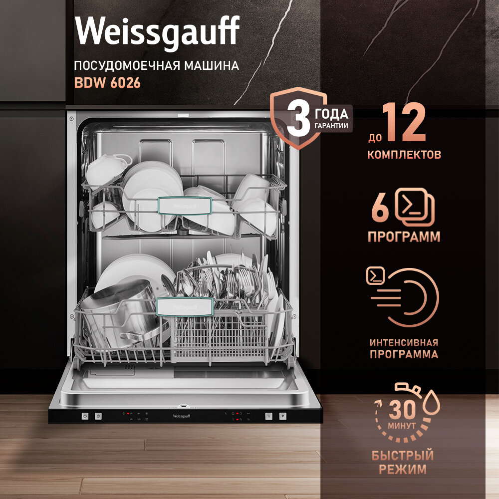 Купить Встраиваемая посудомоечная машина Weissgauff BDW 6026, 3 года гарантии, 12 комплектов посуды, половинная загрузка, 6 программ, быстрый режим, универсальная программа, экономичная программа, таймер, дозагрузка посуды, электронное управление