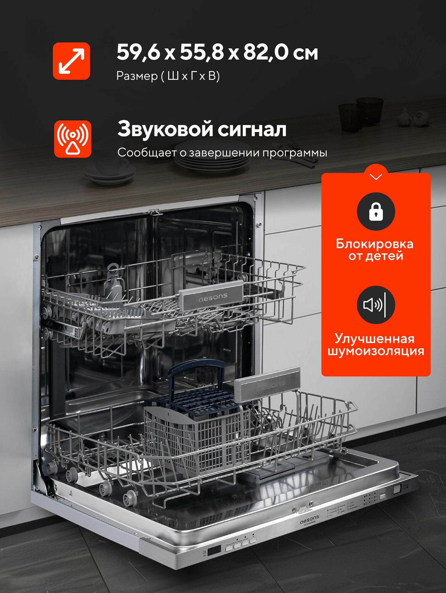 Посудомоечная машина встраиваемая 60 см NESONS NS-DW60NSGB интересное: