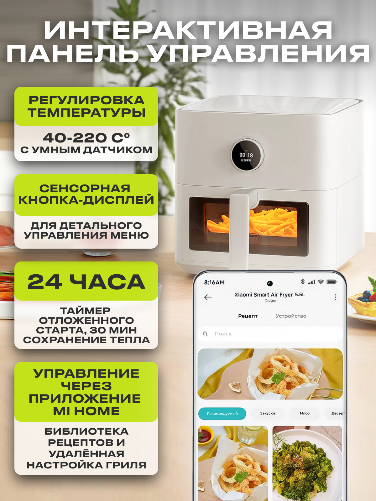 Аэрогриль/Аэрофритюрница 5,5 литра с окном Xiaomi Mi Smart Air Fryer, EU-Русская версия интересное: