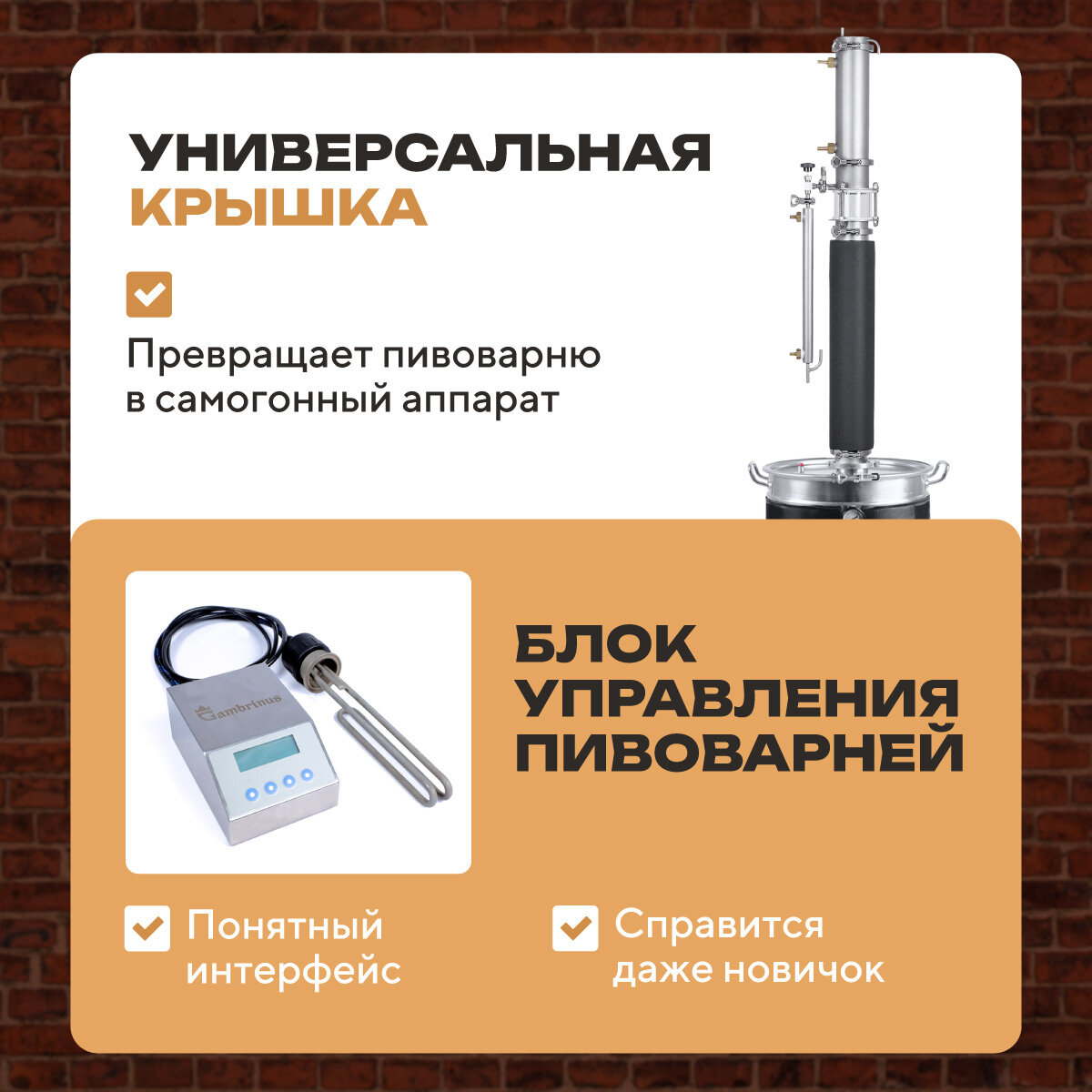 | Дополнительная информация | Пивоварню ПВК “Гамбринус” можно использовать как: пивоварню; самогонный аппарат (для этого нужно просто установить колонну на 2 или 3 дюйма); ферментер ; сыроварня; Су-вид |