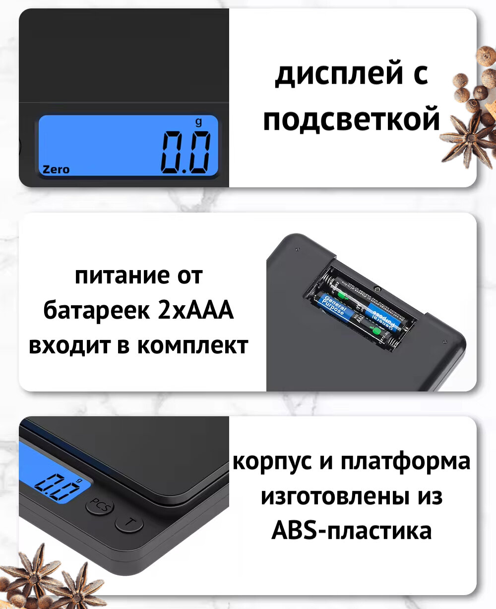 | Дополнительная информация | ✅ 1 * Весы электронные настольные ✅ 2 * Батарейки ААА ✅ 1 * Инструкция ✅ 1 * Упаковка (картонная коробка) ✅ 1 * Влагоустойчивый пакет |