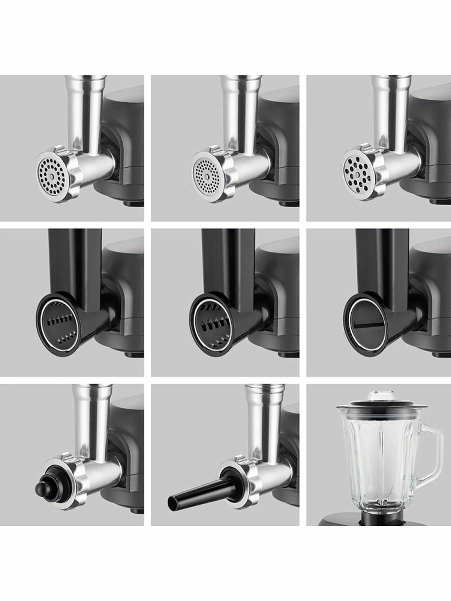 | Плюсы: | Сочетает в себе 3 устройства, можно докупить мясорубку и блендер, достаточно низкая цена. Так же имеется защитный экран для замеса теста, чтобы не разлеталась мука. Оптимальный набор насадок позволяет готовить огромное количество блюд, в комплекте идёт книга с рецептами. |