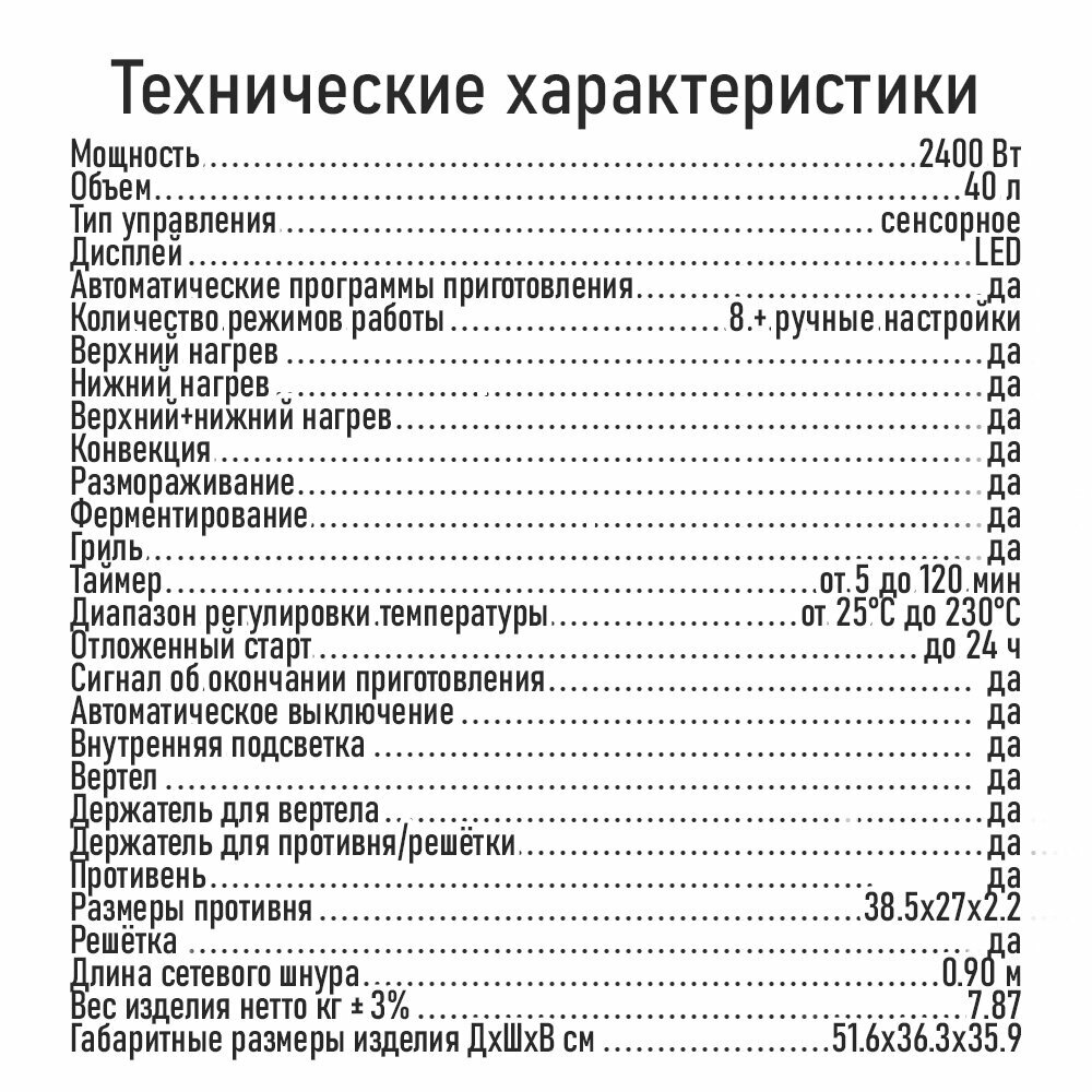 Духовка электрическая, вертел, конвекция, гриль 40 л