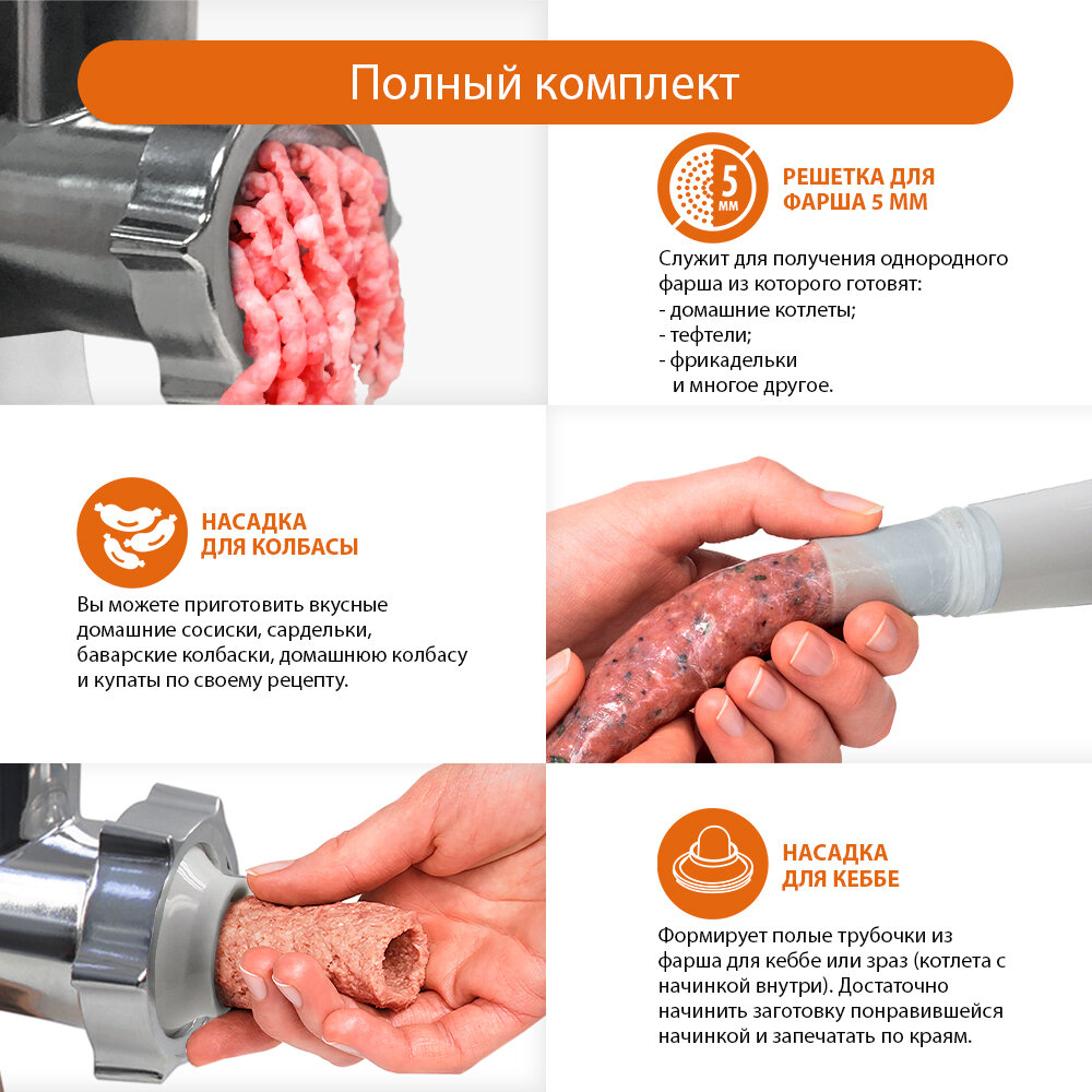 | Насадки | диск для фарша / насадка для кеббе / насадка для приготовления колбас |