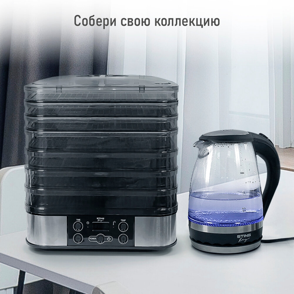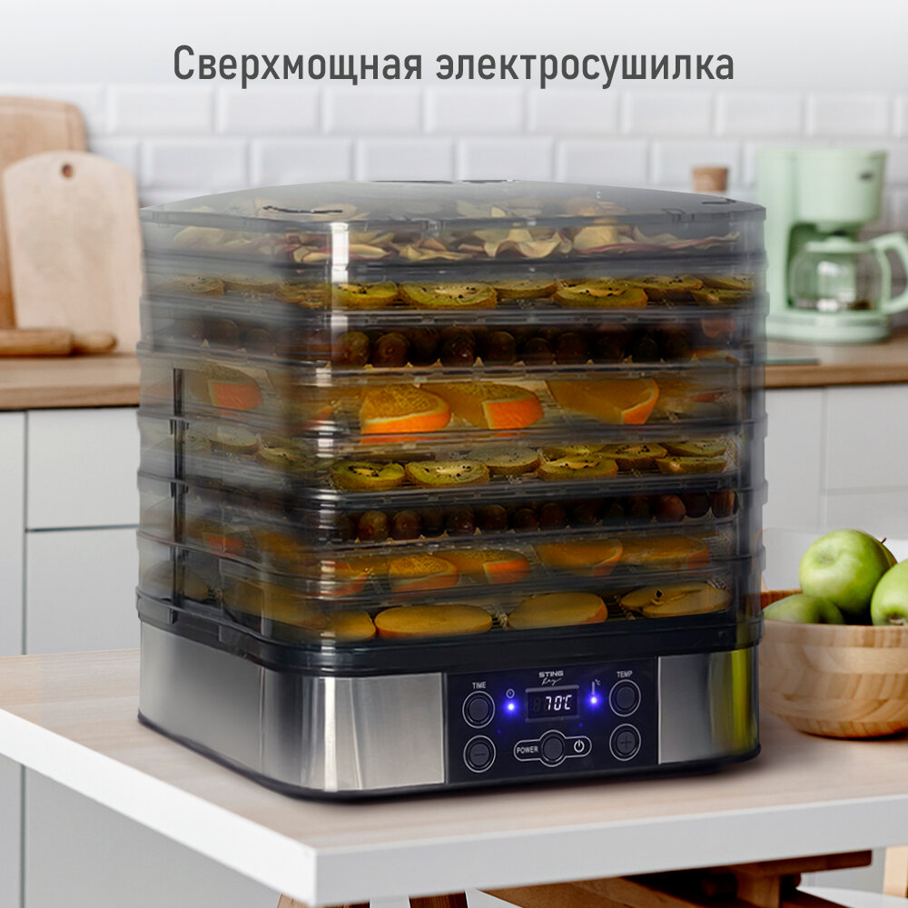 Электросушилка STINGRAY ST-FD701A 11 поддонов: 4 разборных поддона для сушки, 3 обычных поддона, 2 для ягод, 2 для пастилы черный жемчуг интересное: