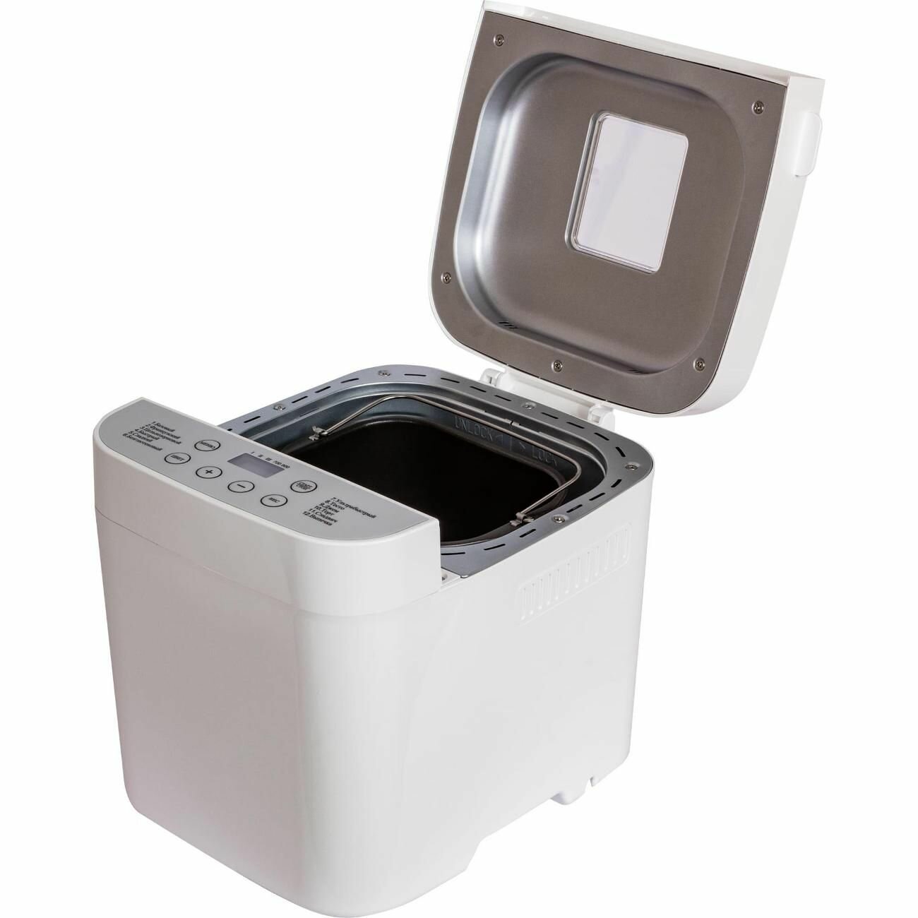 | Дополнительная информация | Отложенный старт; Поддержание температуры после выпекания; Индикация включениявремени приготовления; Прорезиненные ножки; Дисплей; Съемная форма; Звуковой сигнал; Окно контроля процесса; Сохранение программы при сбое электропитания; Отключение звукового сигнала; Программы хлебопечения: безглютеновый хлеб/безглютеновый кекс/ржаной хлеб/бородинский хлеб; Программы приготовления: тесто/варенье/кекс; Дополнительно в комплекте: мерный стакан, мерная ложка |