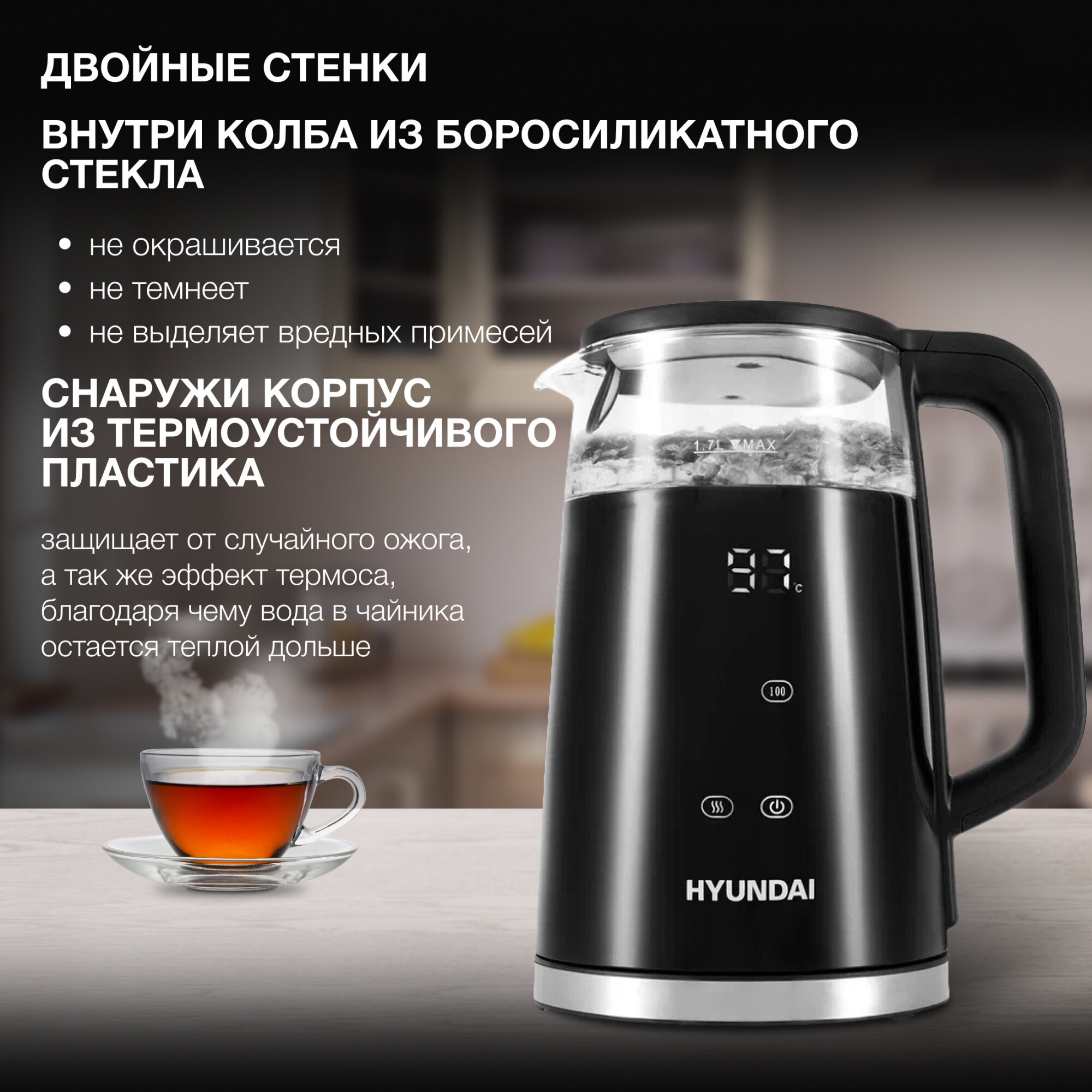 Чайник электрический Hyundai HYK-G6404 1.7л. 2200Вт черный/серебристый (корпус: стекло) интересное: