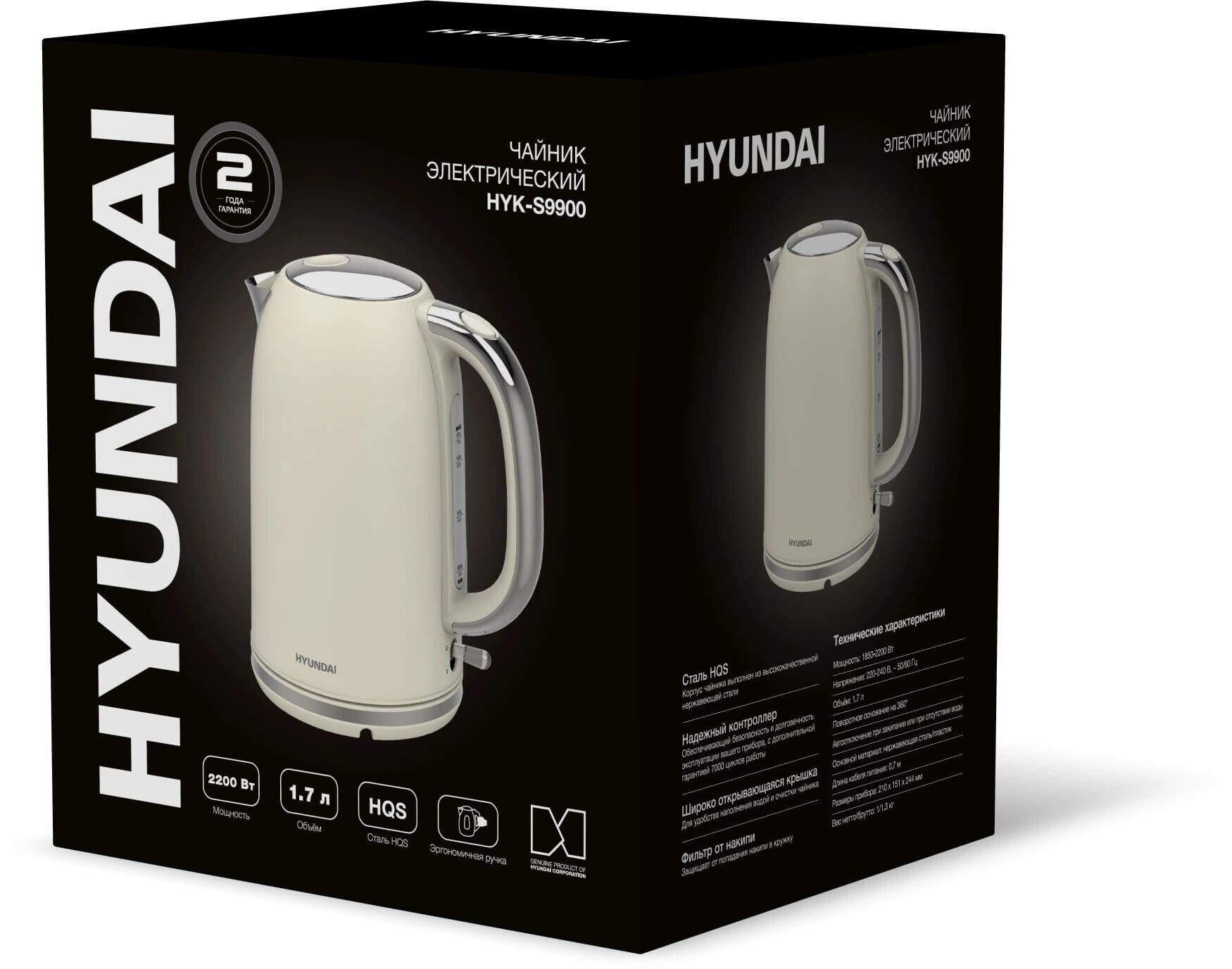 Электрочайник Hyundai HYK-S9900 бежевый [1.7 л, 2200 Вт, скрытый нагревательный элемент, фильтр, мат