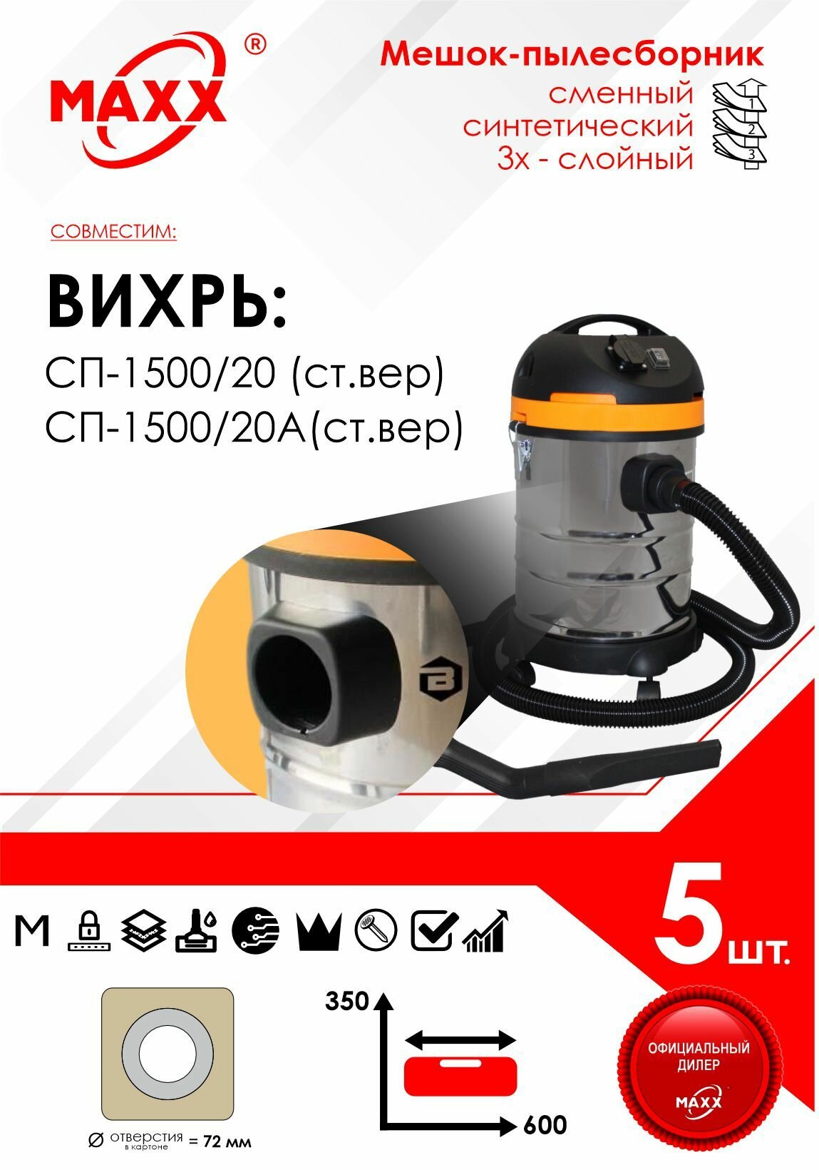 Мешок - пылесборник PRO 5 шт. для пылесоса вихрь СП-1500/20, СП-1500/20А (старой версии)