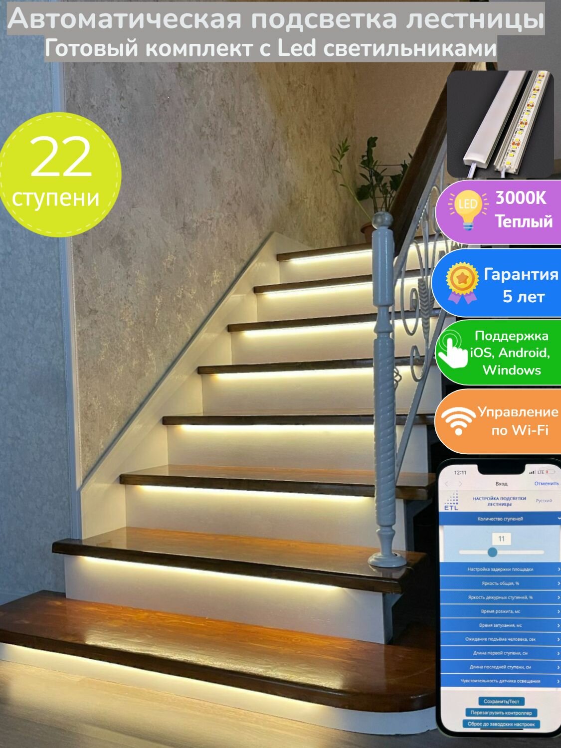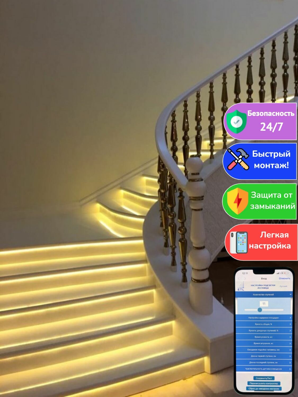 Ниже Вы можете прочитать отзывы на Комплект автоматической подсветки 22 ступеней лестницы с датчиками движения ETL, система умный дом, свет теплый-3000К, ознакомится с подробными характеристиками, посмотреть интересные обзоры и фотографии на Комплект автоматической подсветки 22 ступеней лестницы с датчиками движения ETL, система умный дом, свет теплый-3000К.