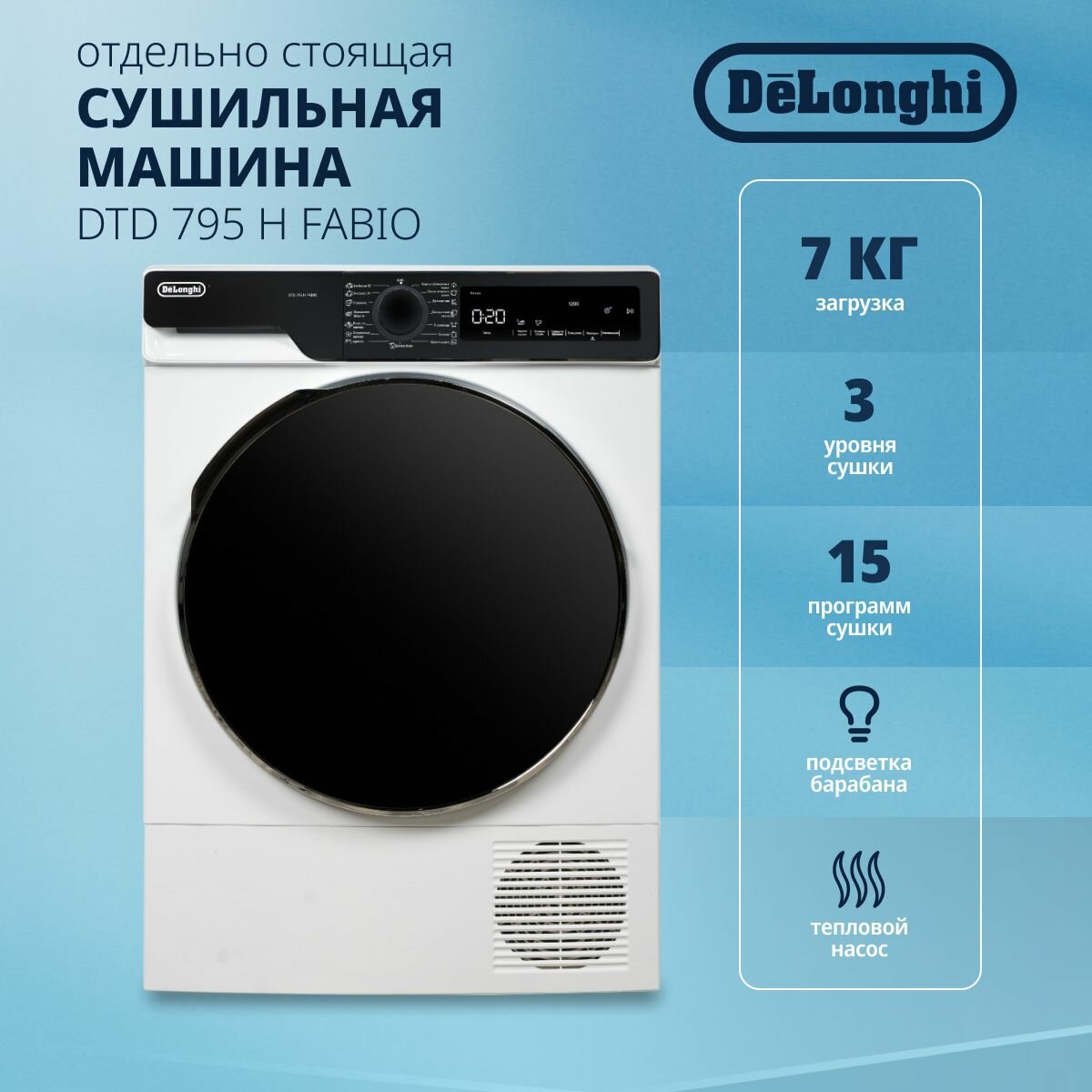 Сушильная машина DeLonghi DTD 795 C FABIO отдельностоящая, 7 кг, белая, 3 уровня сушки, подсветка барабана