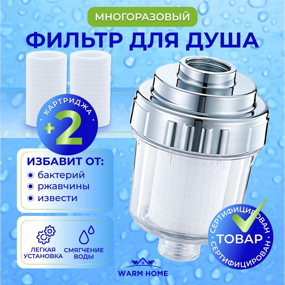 Фильтр для душа, для воды и бытовых приборов Warm Home, с 2 сменными картриджами. Проточный, универсальный. интересное: