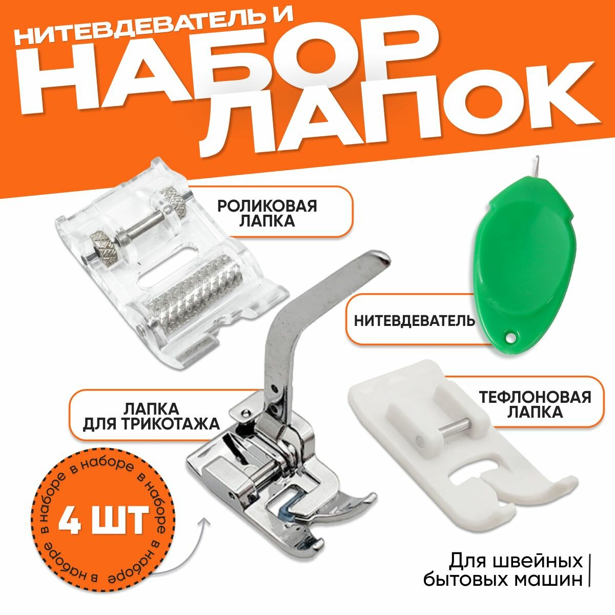 Купить Лапка швейная тефлоновая скользящая, для трикотажа, роликовая для швейных машин, нитевдеватель, 4шт