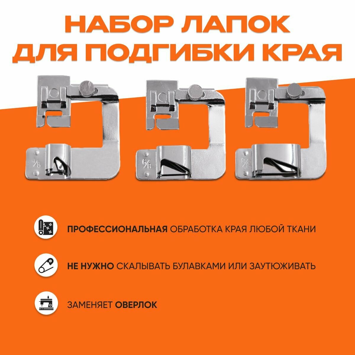 Набор лапок для швейных машин. Лапка подрубочная, лапка для подгибки края, улитка, 3 шт