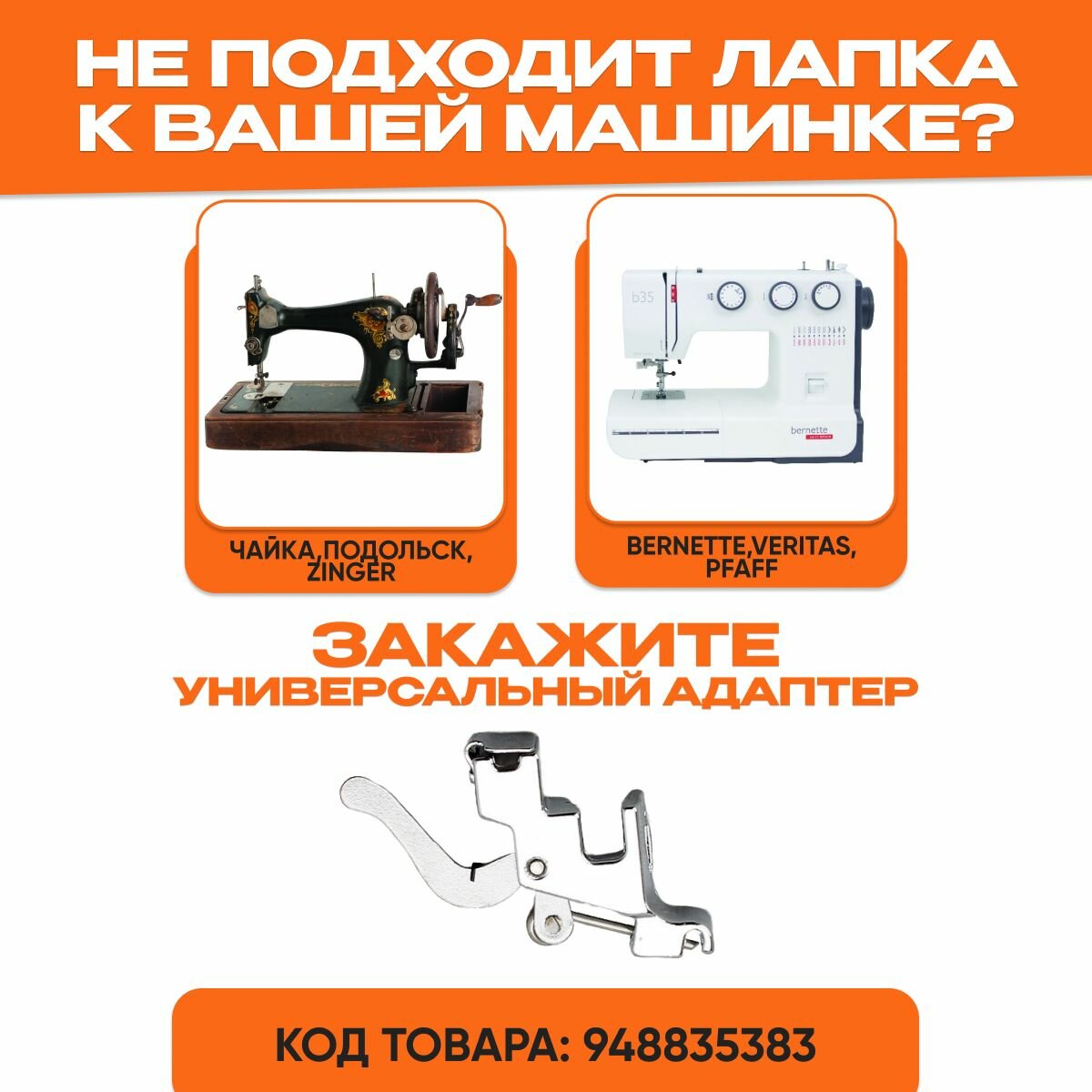 | Назначение лапки | для аппликаций / для вшивания молнии / для декоративных строчек / для защипов / для обмёточных операций / для окантовывания / для подрубки/подгибки / для потайного шва / для потайной молнии / для потайной строчки / для пришивания канта / тесьмы / ленты / для пэчворка / для сосбаривания / для толстых швов / для трикотажа / для штопки / универсальная / шагающая |
