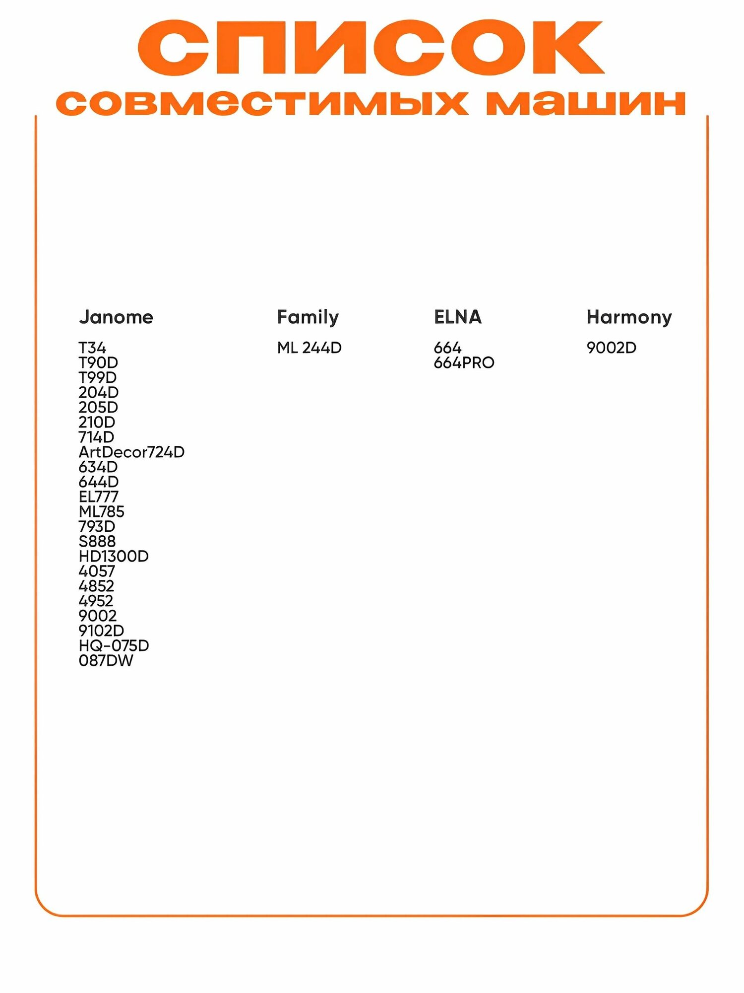 | Совместимость | Janome - T34, T90D, T99D, 204D, 205D, 210D, 714D, ArtDecor724D, 634D, 644D, EL777, ML785, 793D, S888, HD1300D, 4057, 4852, 4952, 9002, 9102D, HQ-075D, 087DW Family - ML 244D Harmony 9002D ELNA - 664, 664PRO |