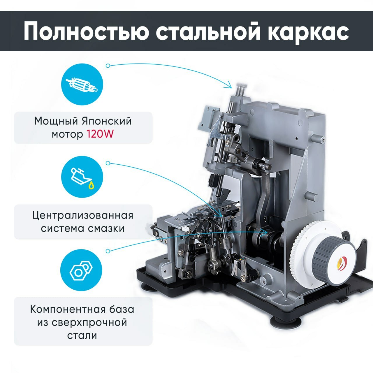 | Дополнительные функции | автоматическая заправка иглы, дифференциальная подача, заправщик нижнего петлителя, отключение ножа, регулировка ширины обреза ткани |