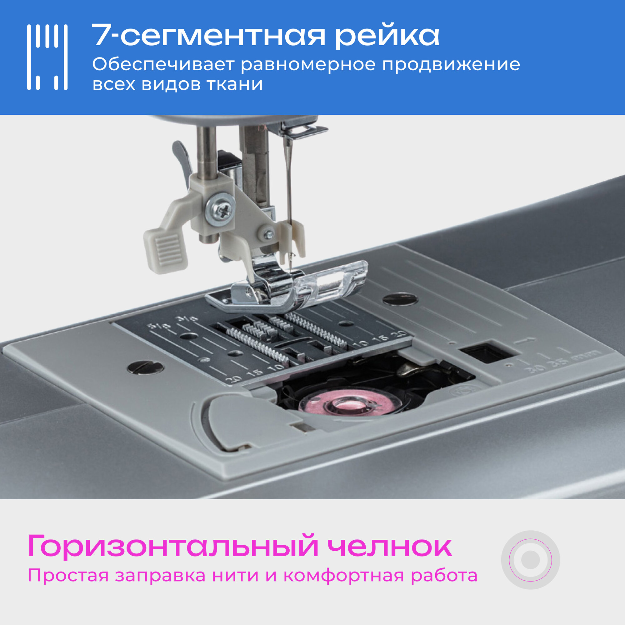 | Функциональные особенности швейного оборудования | Линейка на корпусе, Подсветка рабочей зоны, Реверс, Шитье в нескольких направлениях, Шитье двойной иглой |