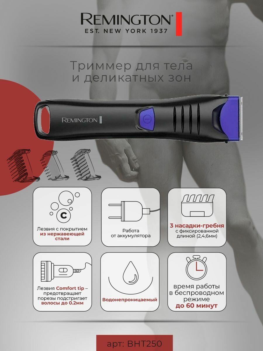 Триммер для тела и деликатных зон Remington BHT250, 3 насадки-гребня, лезвия Comfort tip, работа от аккумулятора, время работы до 60 минут интересное: