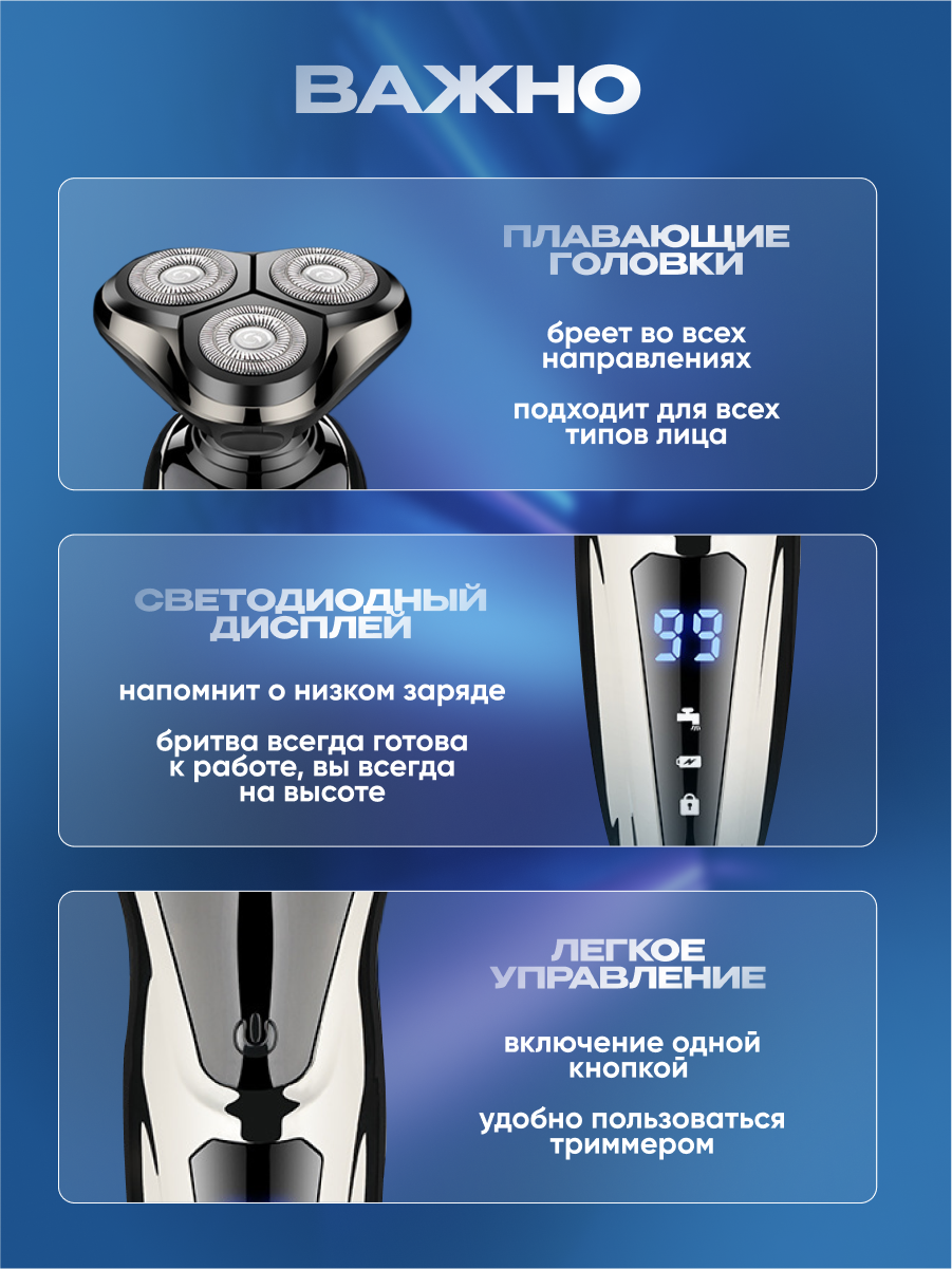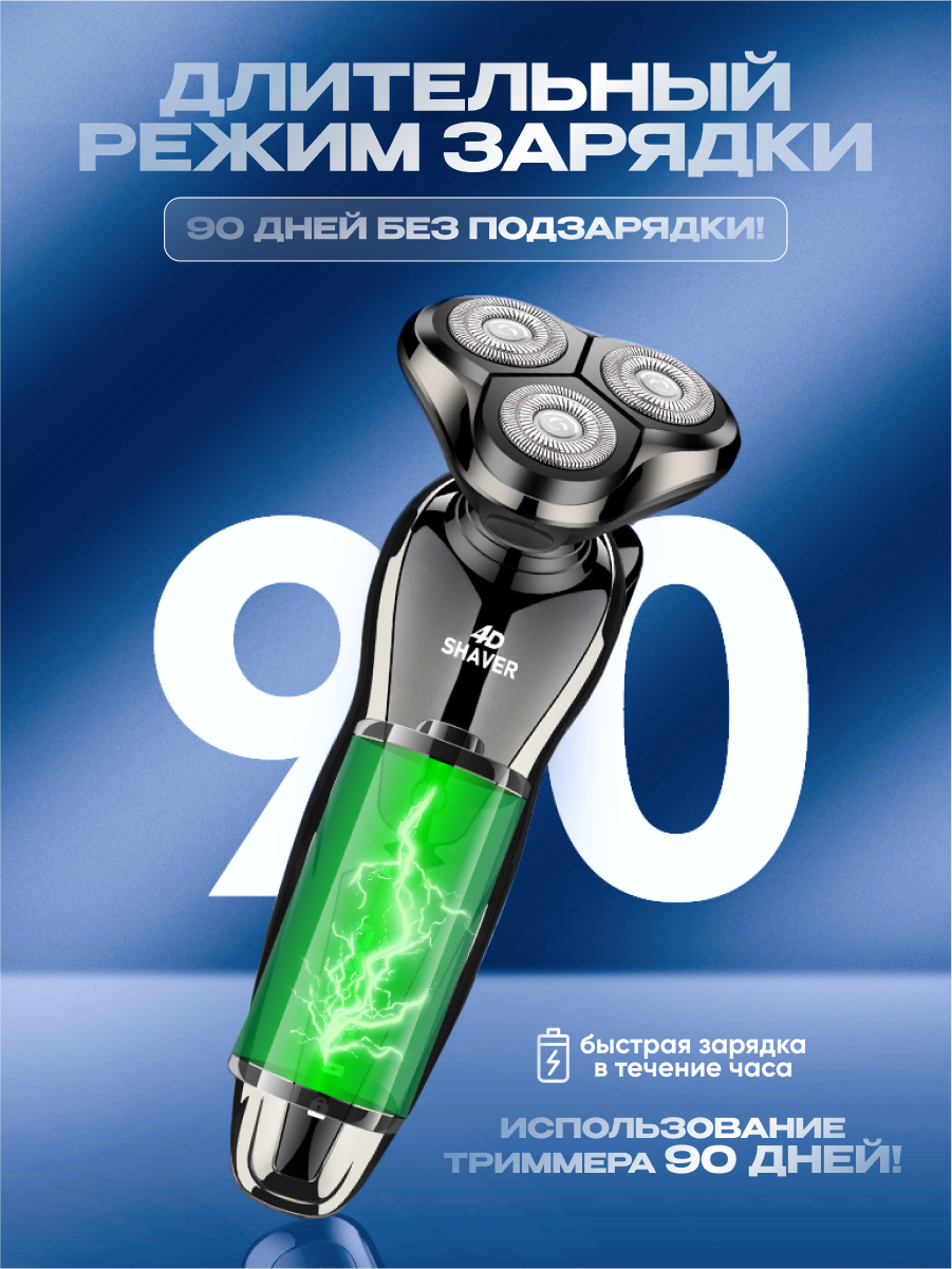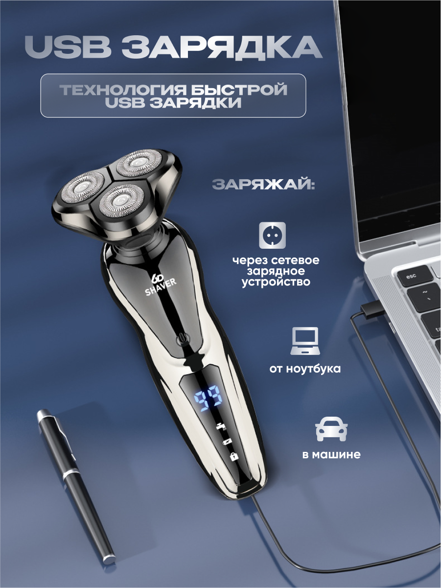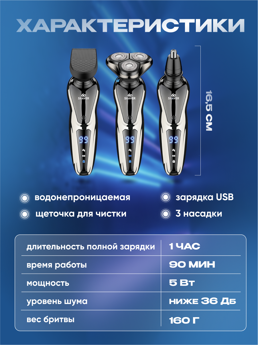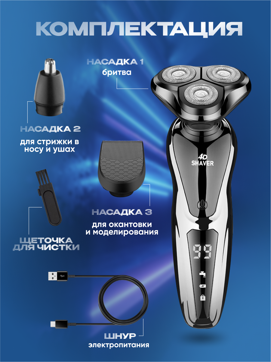 | В комплекте | бритвенный станок / защитный колпачок / кабель USB / насадка для бороды / насадка для носа / насадка для стрижки волос в носу / сменный нож / щеточка |
