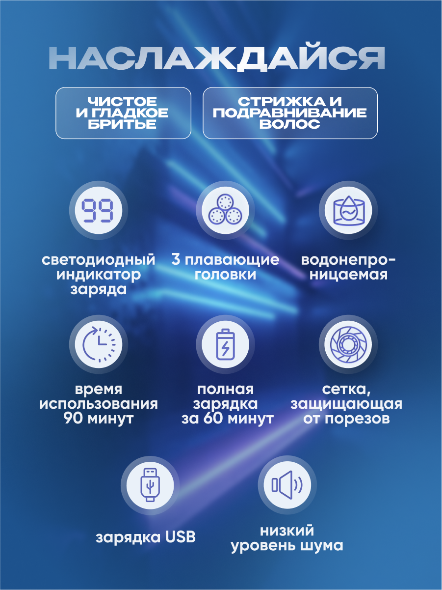 | Особенности | быстрая зарядка / влагозащищенный корпус / индикатор зарядки / подсветка / роторный двигатель / сенсорный экран |