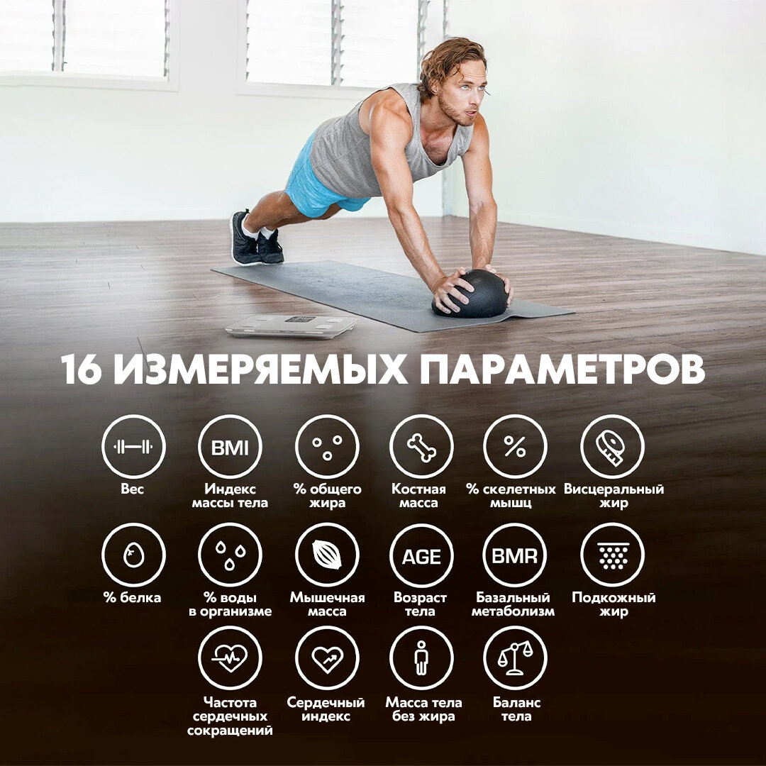 | Дополнительная информация | Измерения параметров тела: Вес, Индекс массы тела, Висцеральный жир, Костная масса, Мышечная масса, Содержание воды, Тип телосложения, Измерение белка, Жировая масса, Базальный метаболизм, Биологический возраст, Метаболизм, Скелетные мышцы |
